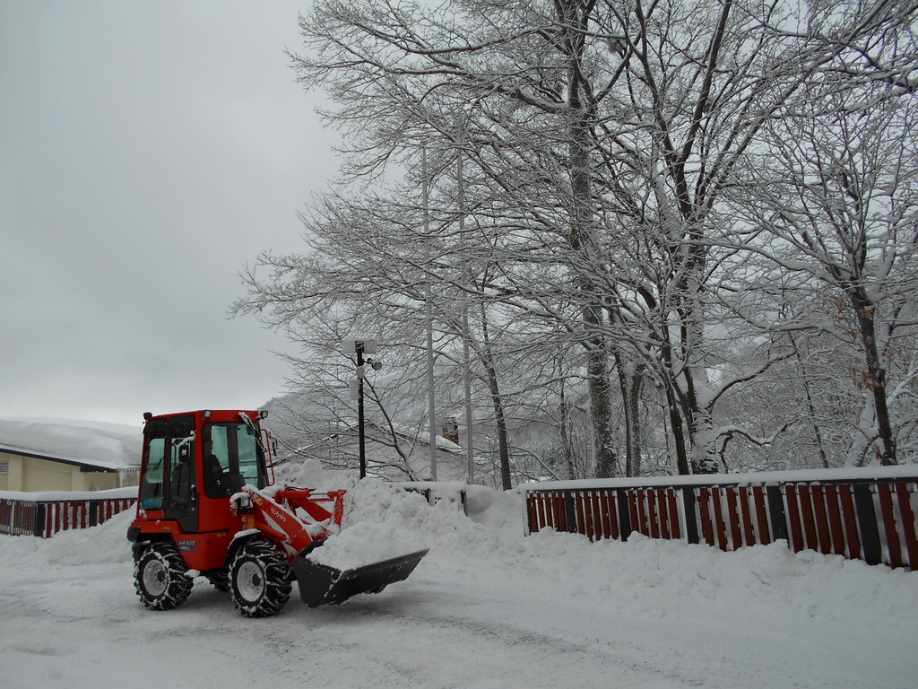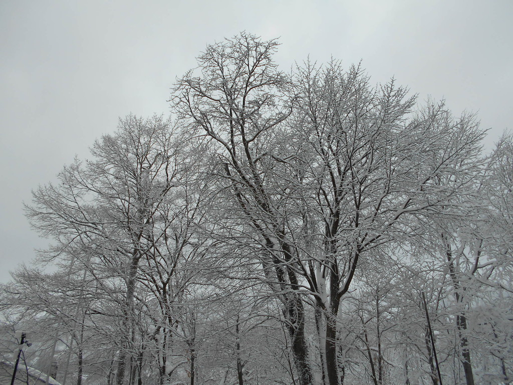 ル・ベール蔵王玄関前・朝7時・−6度・濃霧温泉街雲の下・雪・強風・昨夜20cm以上の積雪・昨日除雪しアスファルト面が出ていた駐車場一面真っ白なパウダースノー・無風木々に雪が着きました。ホワイトアウトのバーンの吹溜り50cm以上積もっているので気をつけてお滑り下さい。昨日のかもしか大橋と蔵王温泉大露天風呂です。