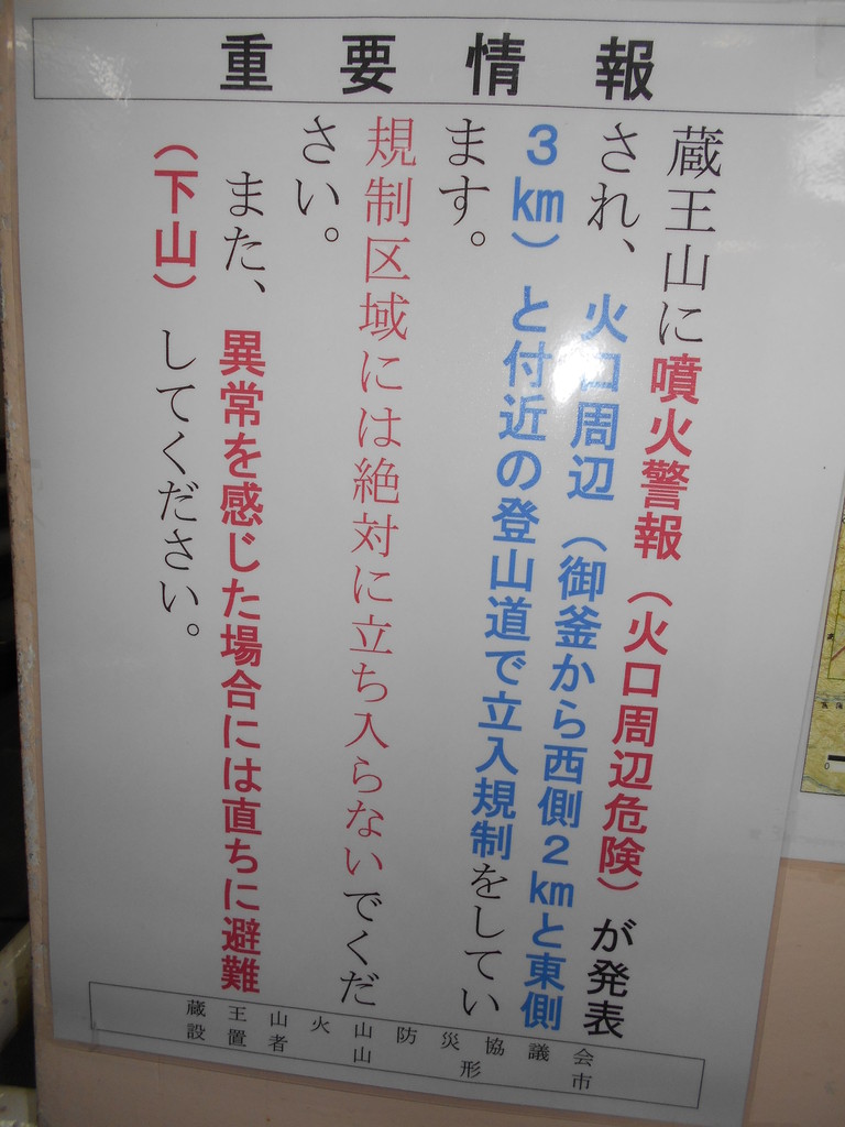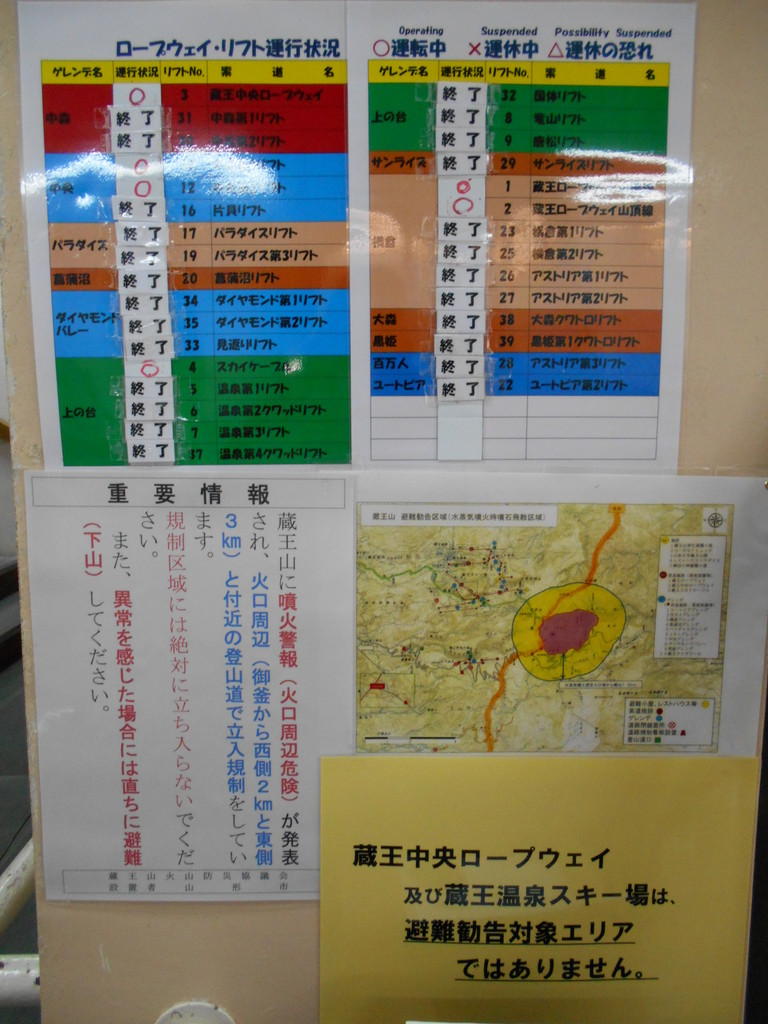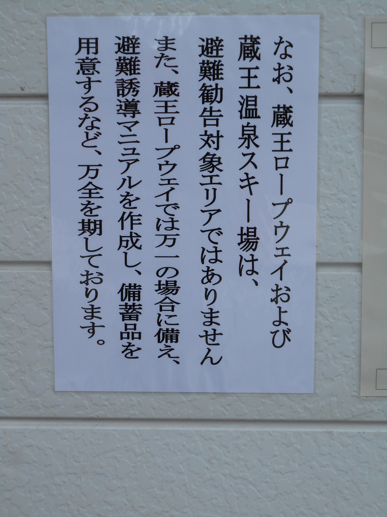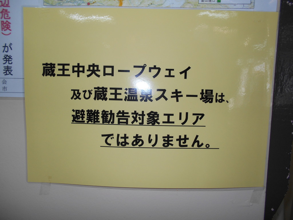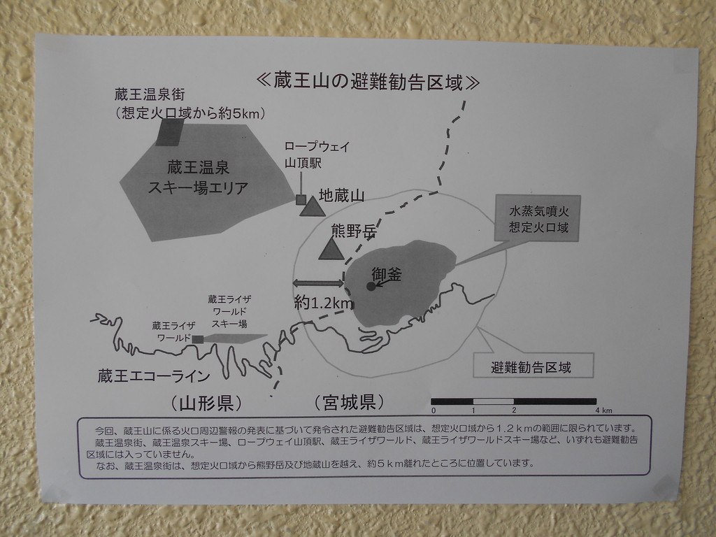 温泉駅に火山の避難勧告エリア外と掲示されています。宮城県にあるお釜から蔵王温泉は6km離れており間に熊野岳・地蔵山があり避難勧告エリアから離れておりメディアが報じる程気象庁では蔵王温泉が安心できないとは発表していません、大学教授の発言で火口直ぐ側にマイカーで行き行ける珍しい山と言われていますがマイカーで蔵王お釜見学に行かないかぎり避難勧告エリアには行けません。