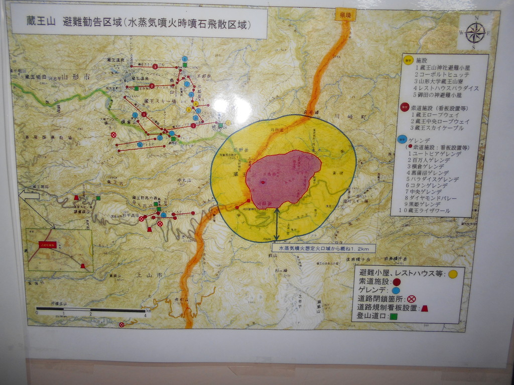 避難勧告区域の地図も掲示されています、蔵王温泉は地図左側です。大学教授の説明では蔵王お釜は観光道路から直ぐ歩いてお釜直近迄行ける活火山で珍しい山で車で沢山の方々が観光出来るから観光客の安全の為報道しているとの事でした。