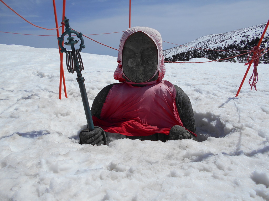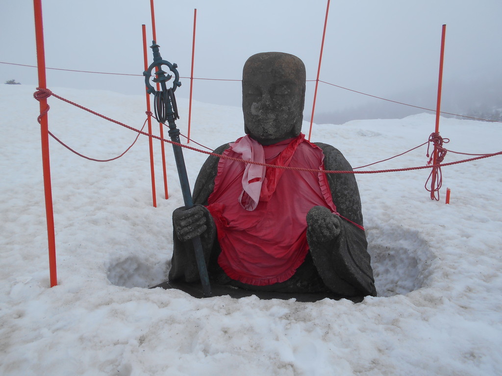 蔵王ロープウェイで山頂に行きました、フニテル強風の為秒速2mで運行ユラユラゆれました、地蔵山頂強風で歩くのに苦労する程でした、蔵王地蔵尊様おなかまで雪の上に出ました!!!頭巾をかぶっていませんでした・強風で飛ばされた???