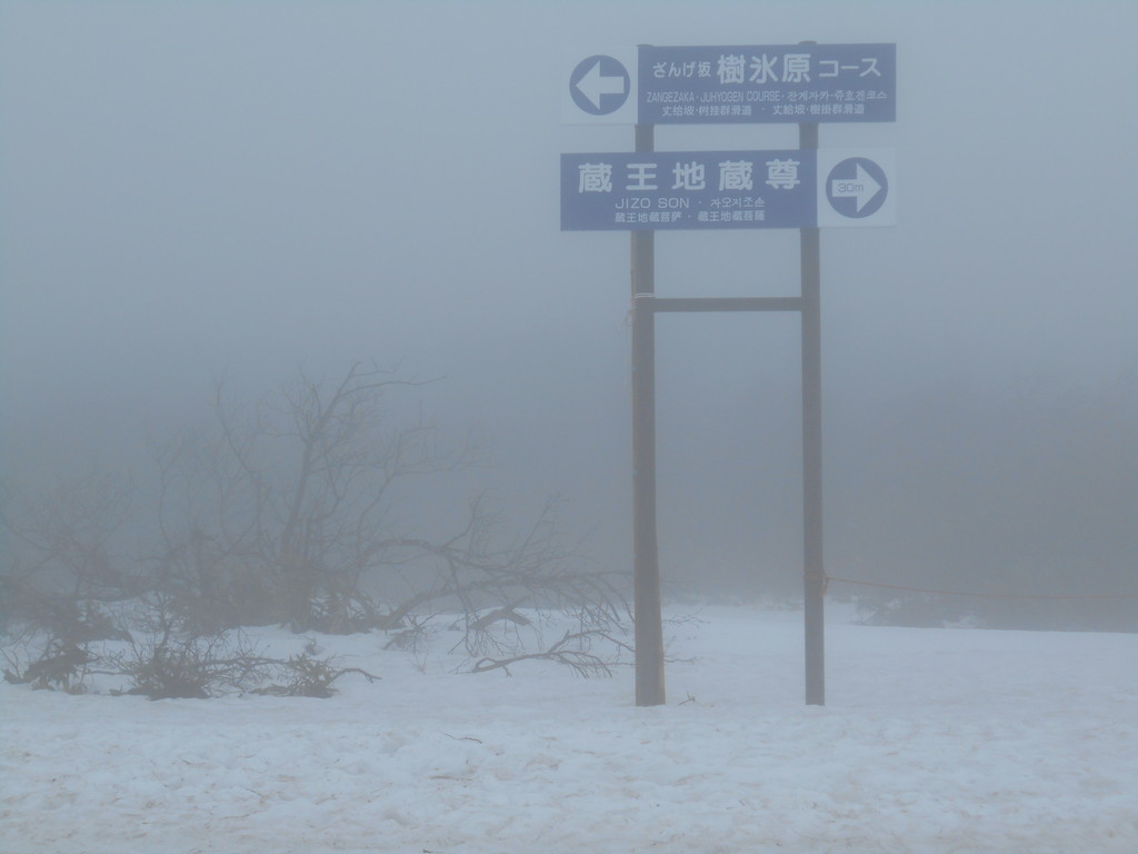 地蔵山頂付近濃霧・暴風20m超えた、案内板4m以上雪の上に出た、ザンゲ坂滑り降りれたが真ん中1,5m巾の残雪後数日で歩く事になりそう???