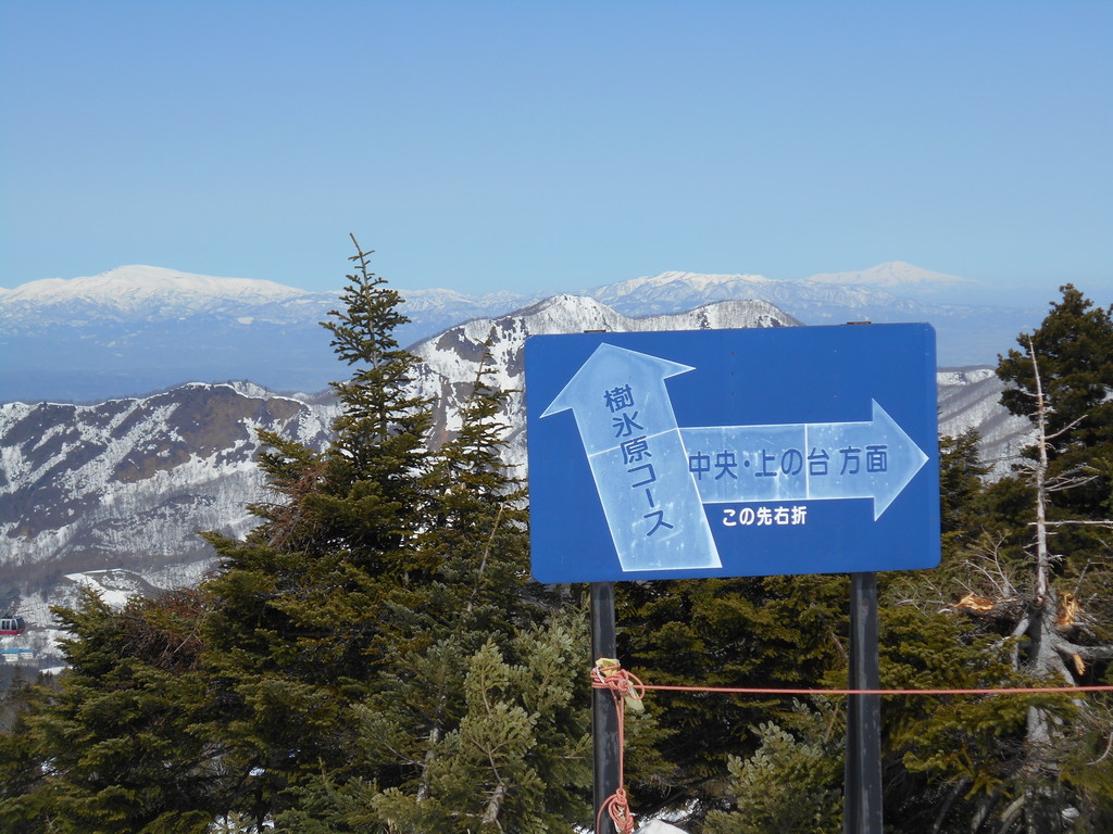 樹氷の写真を写すベストポイント樹氷原55番案内板奥からの右三宝荒神山・真ん中地蔵山左熊野岳です!!!