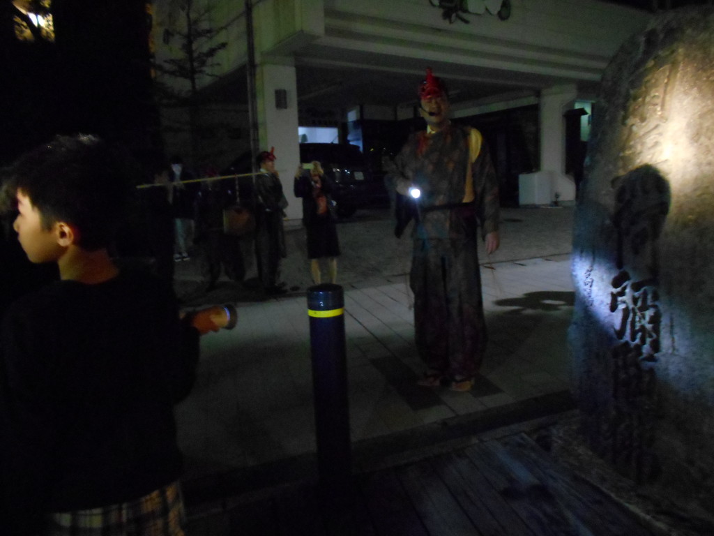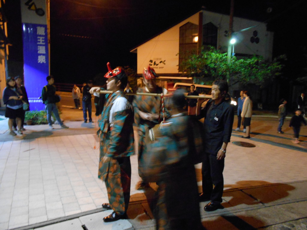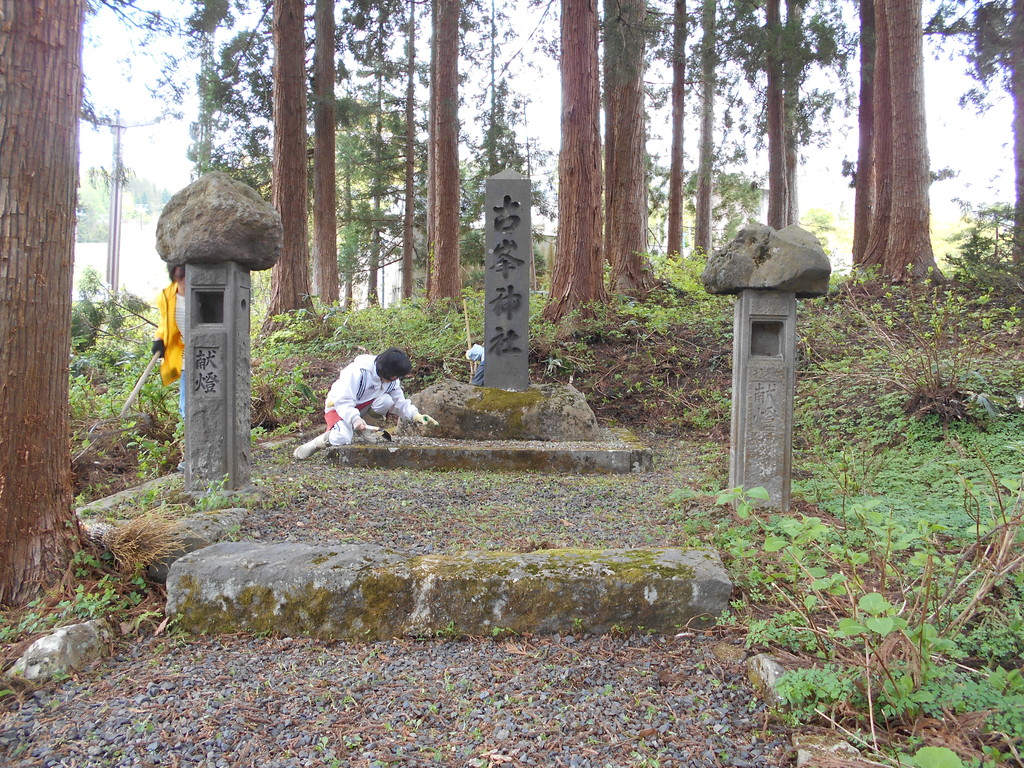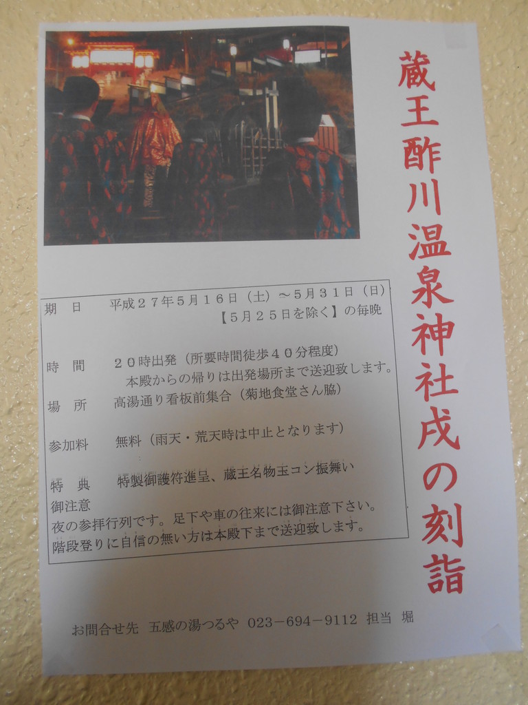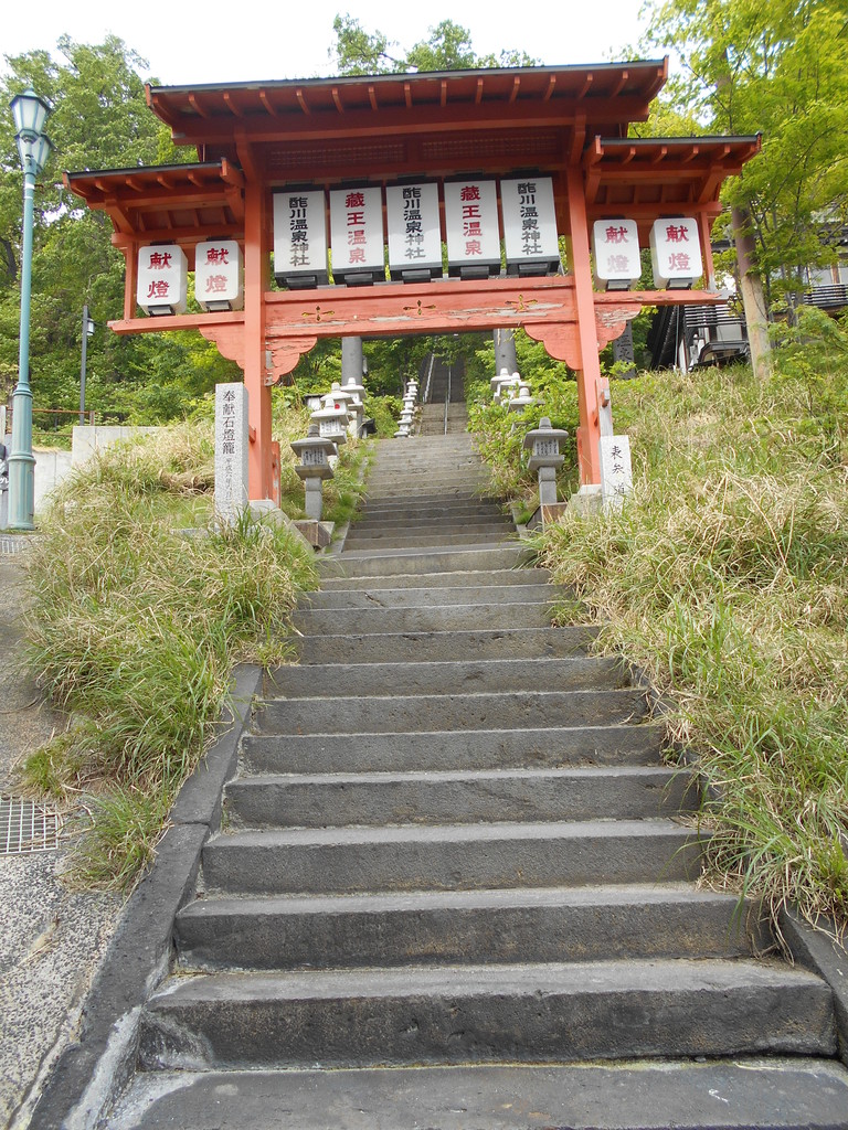 上湯共同浴場左奥の約200段の階段の途中に最上義光が若い頃持ち上げた「力石」があります、階段を上り右側に薬師神社(こけし神社とも言われています)更に階段を登ると蔵王酢川温泉神社です。到着後蔵王大天狗が特製御護符をプレゼントし蔵王名物玉こんにゃくの振舞があります。