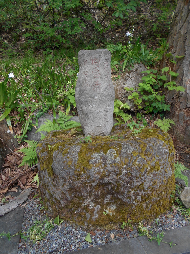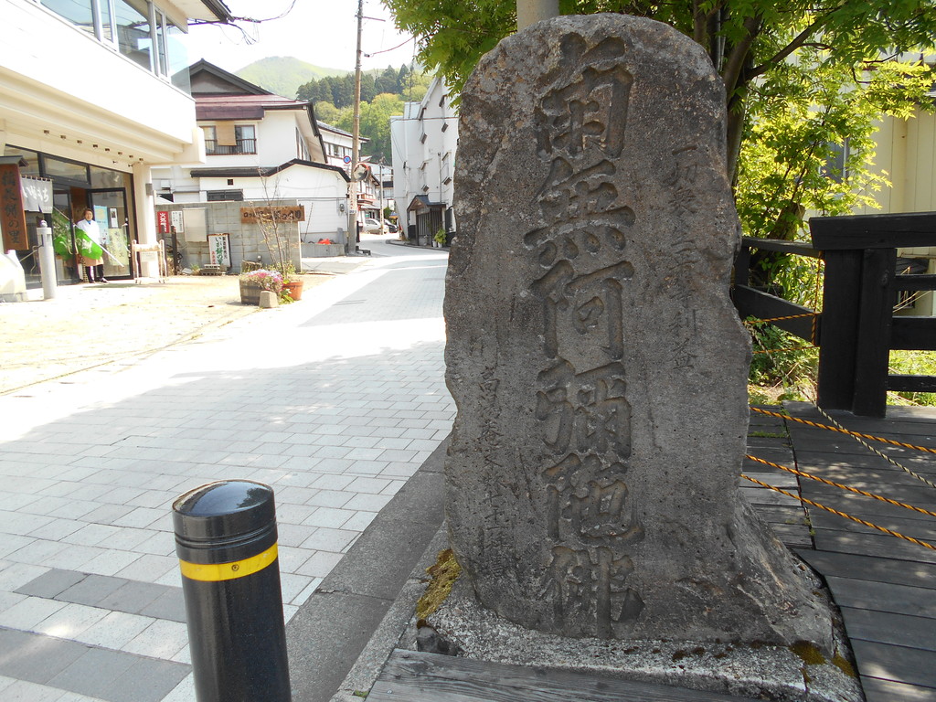 高湯通り酢川脇に旅人の安全を祈願して建立された「南無阿弥陀仏碑」です、左は稲花餅製造販売のまつぽっくりさんです。
