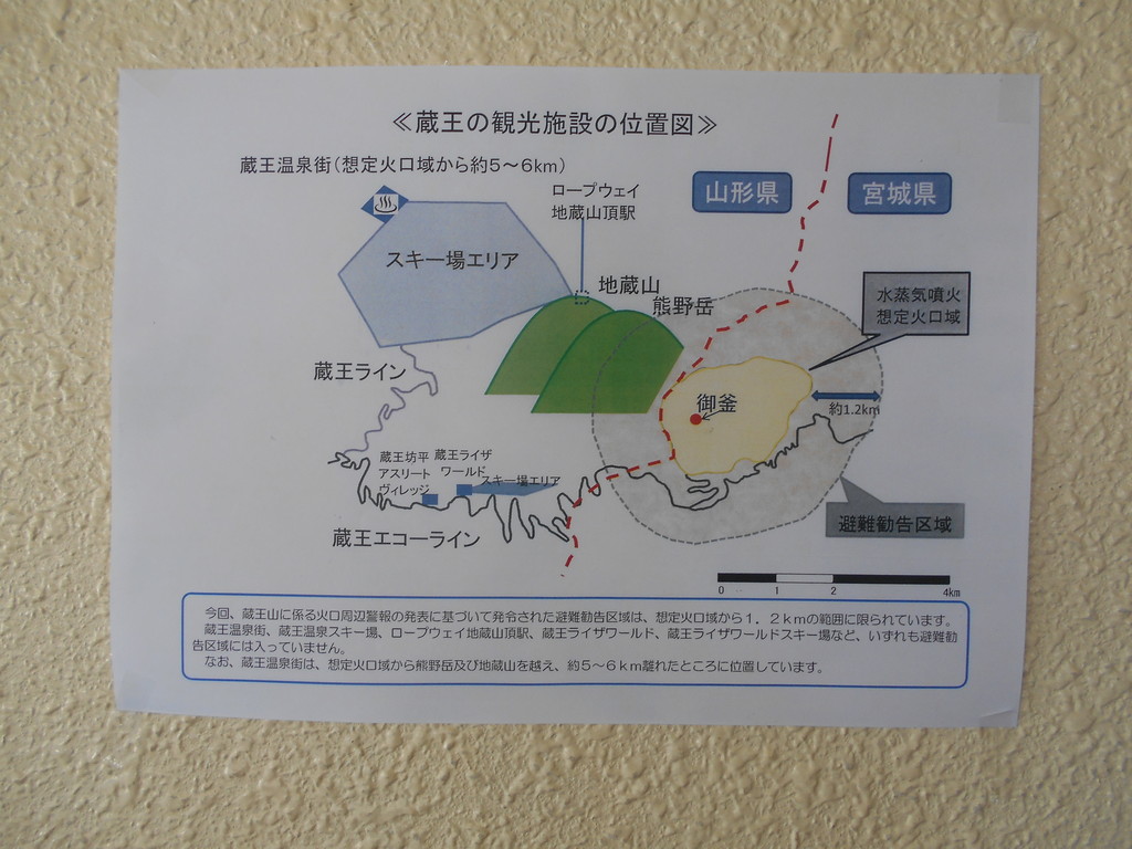 蔵王の観光施設の位置図が配布されました、噴火火口域は宮城県側で赤い県境界線の右側です、熊野岳・地蔵山が火口から右にあり蔵王温泉は6キロ離れています吉村山形県知事も蔵王で開催した山形県知事定例記者会見で新聞記者の質問に安全ですと回答しました!!!日本の活火山でマイカーで行き数分で火口が見える珍しい山で観光名所として沢山のお客様にお出でいただいた景色が学者から危険と発表される事になりました。
