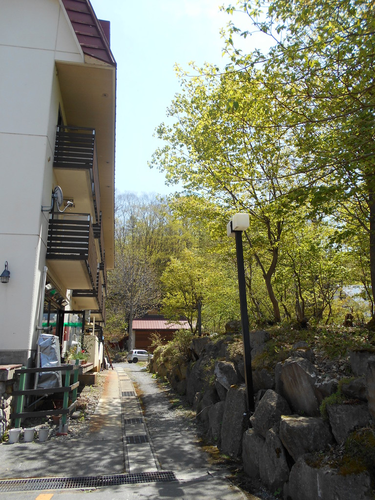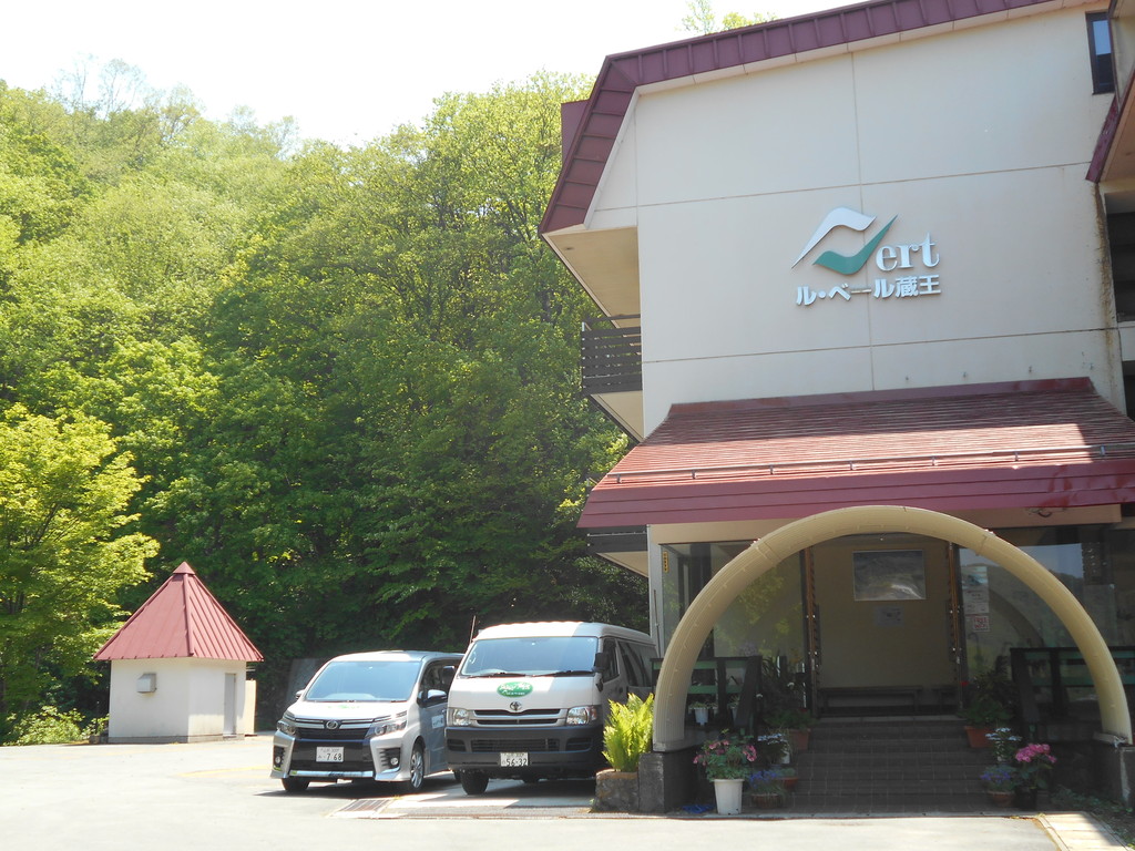 ル・ベール蔵王玄関前・朝7時・13度・雨・無風・全山久しぶりの雨で新緑が綺麗になりました!!!写真は今夜20時出発する四合巡りのスタートつるやさん前です。