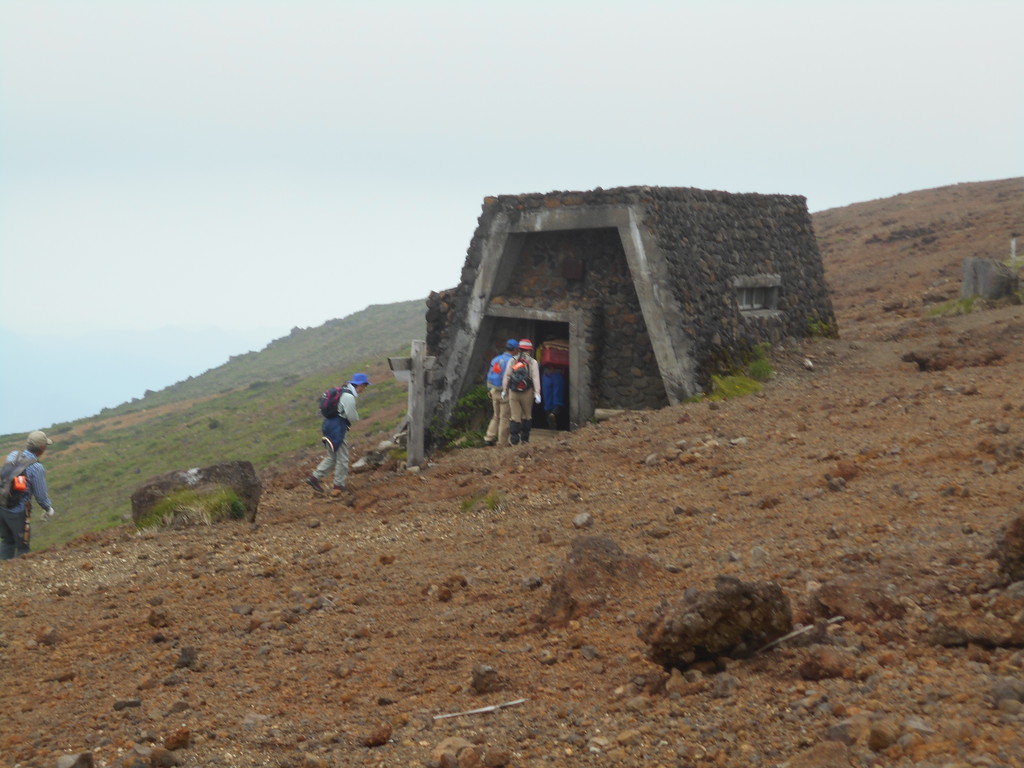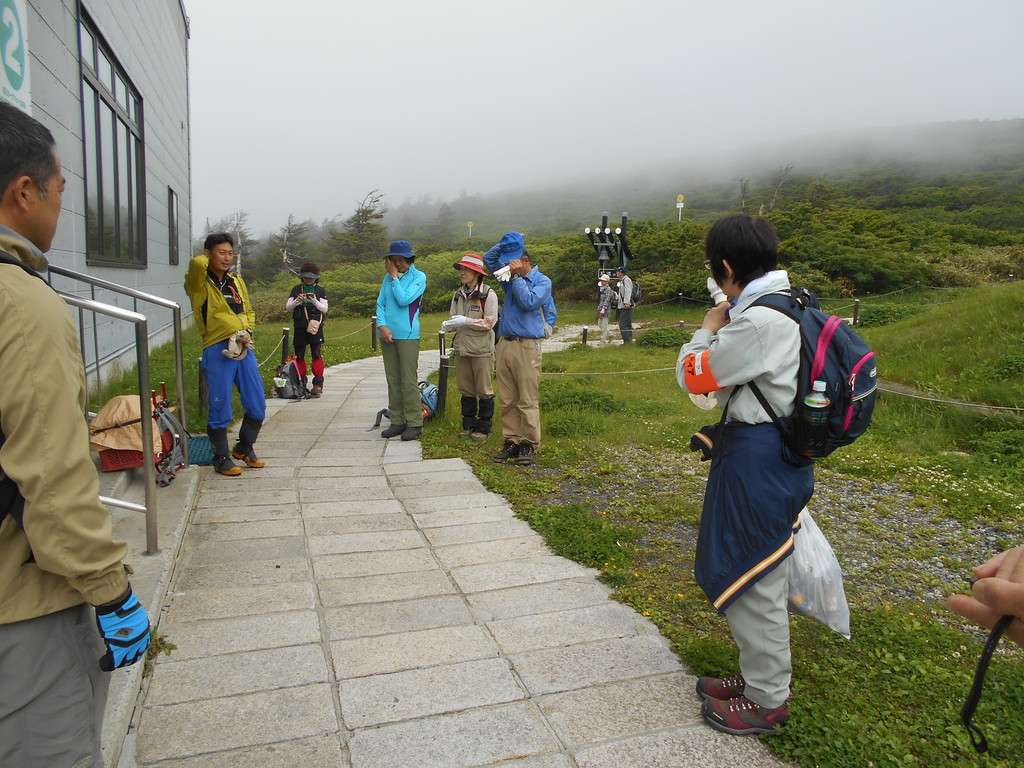 蔵王玄関前・朝7時・15度・曇・陽がさして来ました・中風、写真はワサ小屋跡で休憩中の蔵王パークボランティア!!!