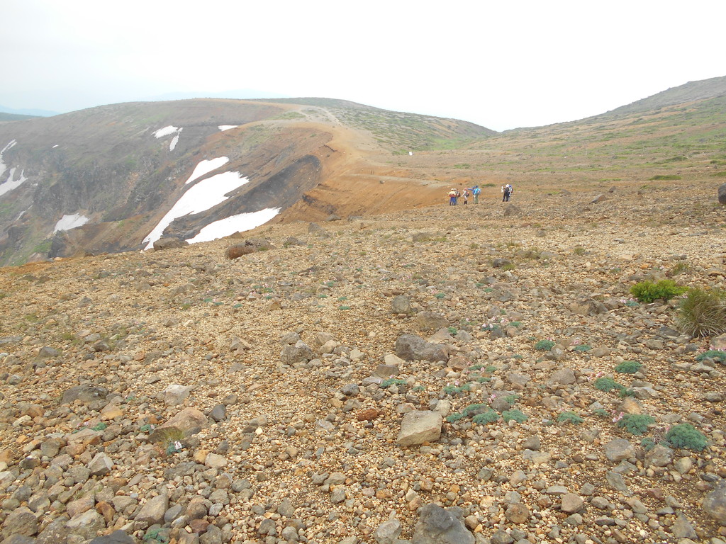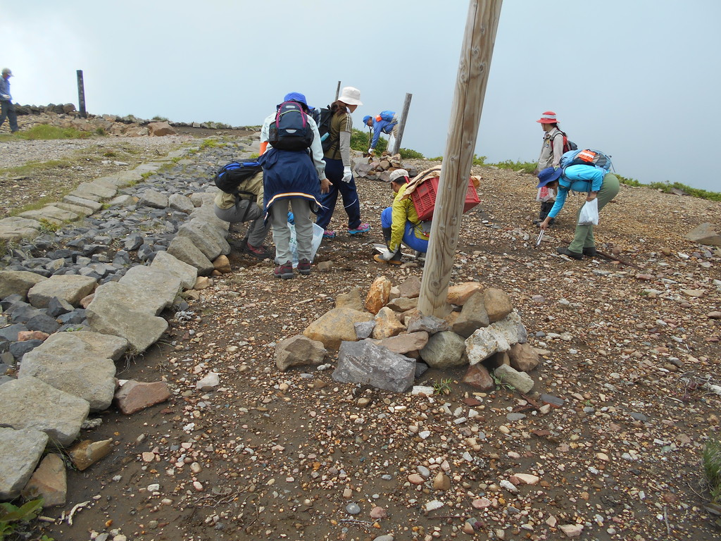 登山道登山者が少ない為かゴミが少なかった、20m毎に立てられている指導柱倒れたり傾いているのは無かった登山道両脇はお花畑でハクサンチドリ・イワガガミが咲き見頃でした。