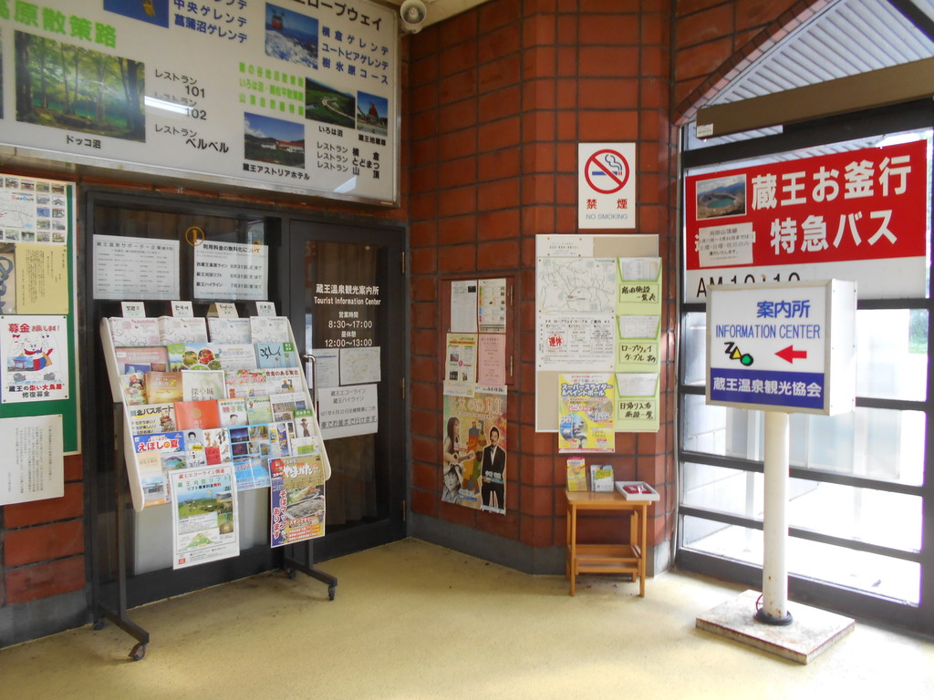 ル・ベール蔵王玄関前・朝7時・20度・薄晴・無風・小鳥が囀っています。今日は蔵王温泉感謝の日・下湯・上湯・川原湯の3共同浴場が無料開放です。蔵王温泉バスターミナルの中にある蔵王温泉観光協会案内所です、最近はネットで予約をなさるお客様が多く宿を紹介しても欲しいとの方はほとんど無いとスタッフが話してくれました!!
