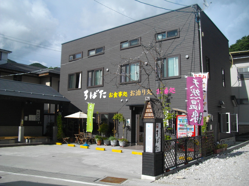 ル・ベール蔵王玄関前・朝7時・20度・快晴・陽がギラギラふりそそいでいます・弱風・小鳥が囀り爽やかな朝です。今日は蔵王ロープウェイで地蔵山頂駅に登り熊野岳のコマクサ観賞に良い日です、朝9時出発のコマクサトレッキングに良い日です、2日前に予約が必要ですが予約参加者があれば当日参加できます。写真はろばた本店です蔵王名物ジンギスカン料理と山菜料理がお食べになれます、夜は予約をしてくださいクローズする事があります。入口左に足湯があります。