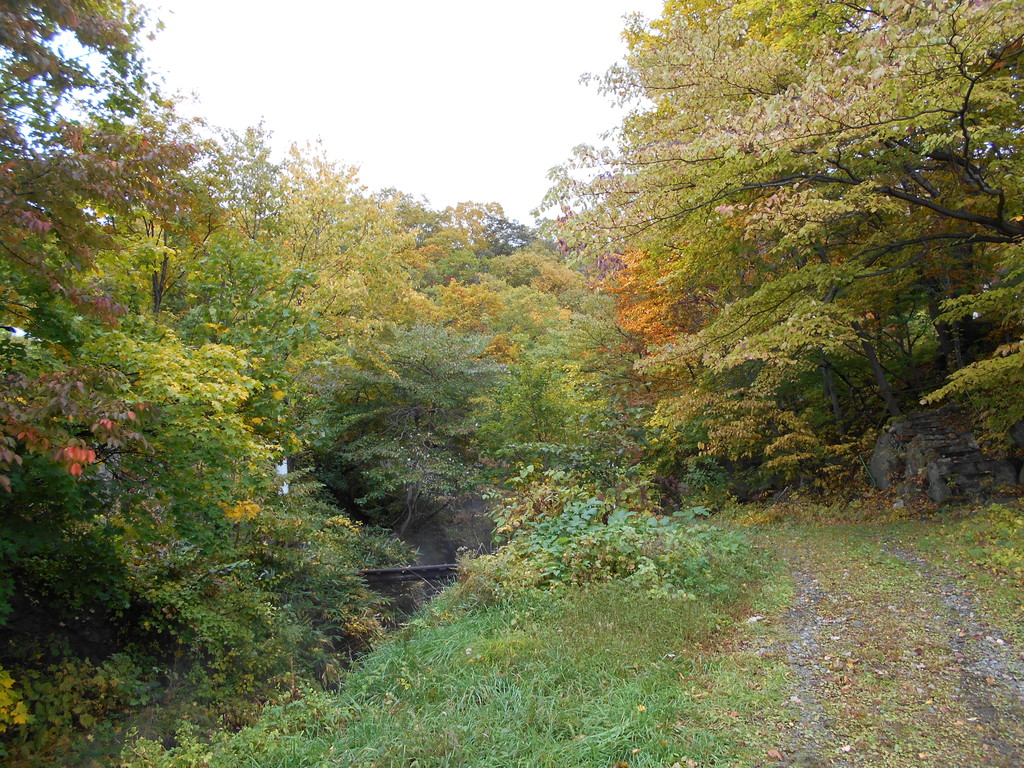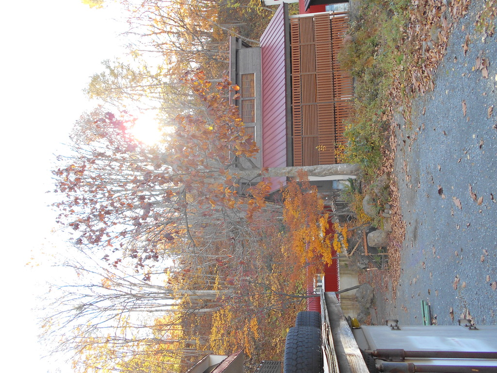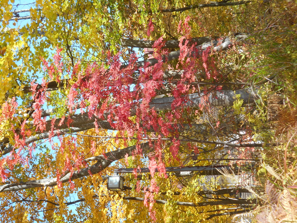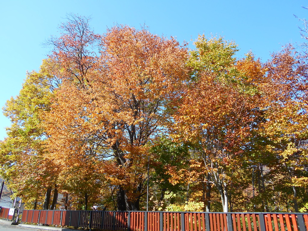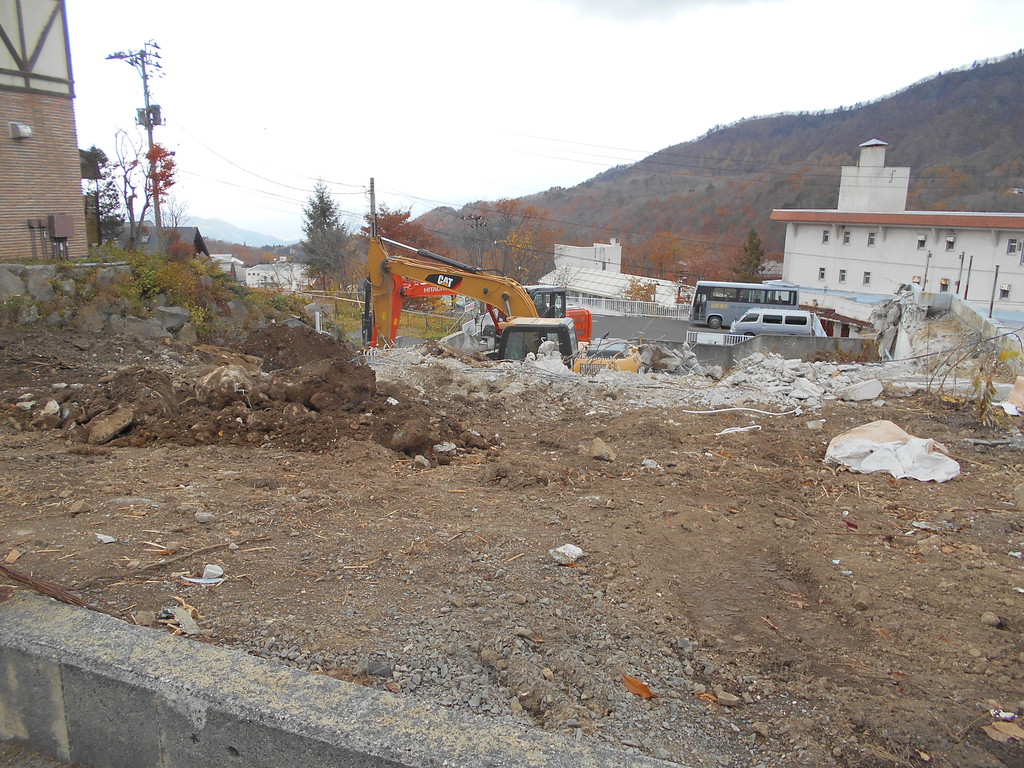 ル・ベール蔵王玄関前・朝7時・7度・晴・無風、標高900m黄葉が始まりました!!!上の台南通りの幽霊屋敷の様にボロボロだったもとさわ旅館解体工事進み鉄骨解体で3階が無くなりました。解体後東京の新オーナーが建物を建てるとの話です。
