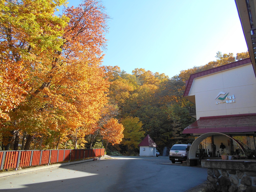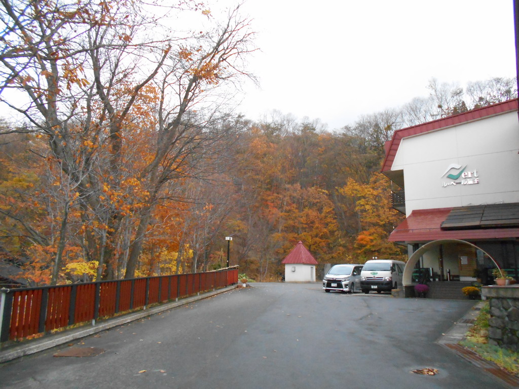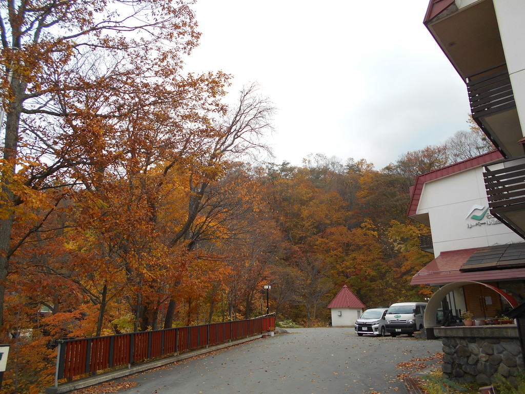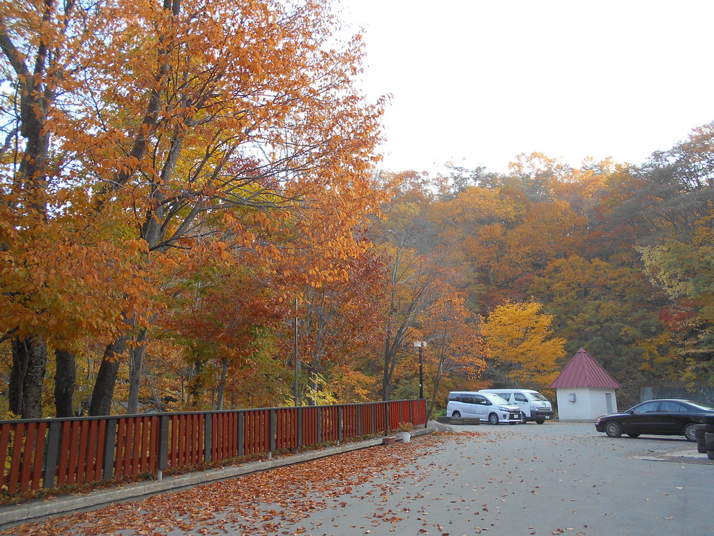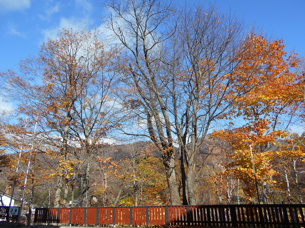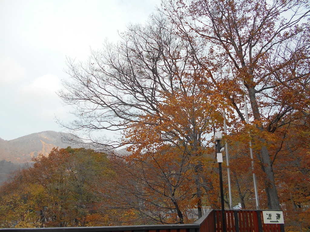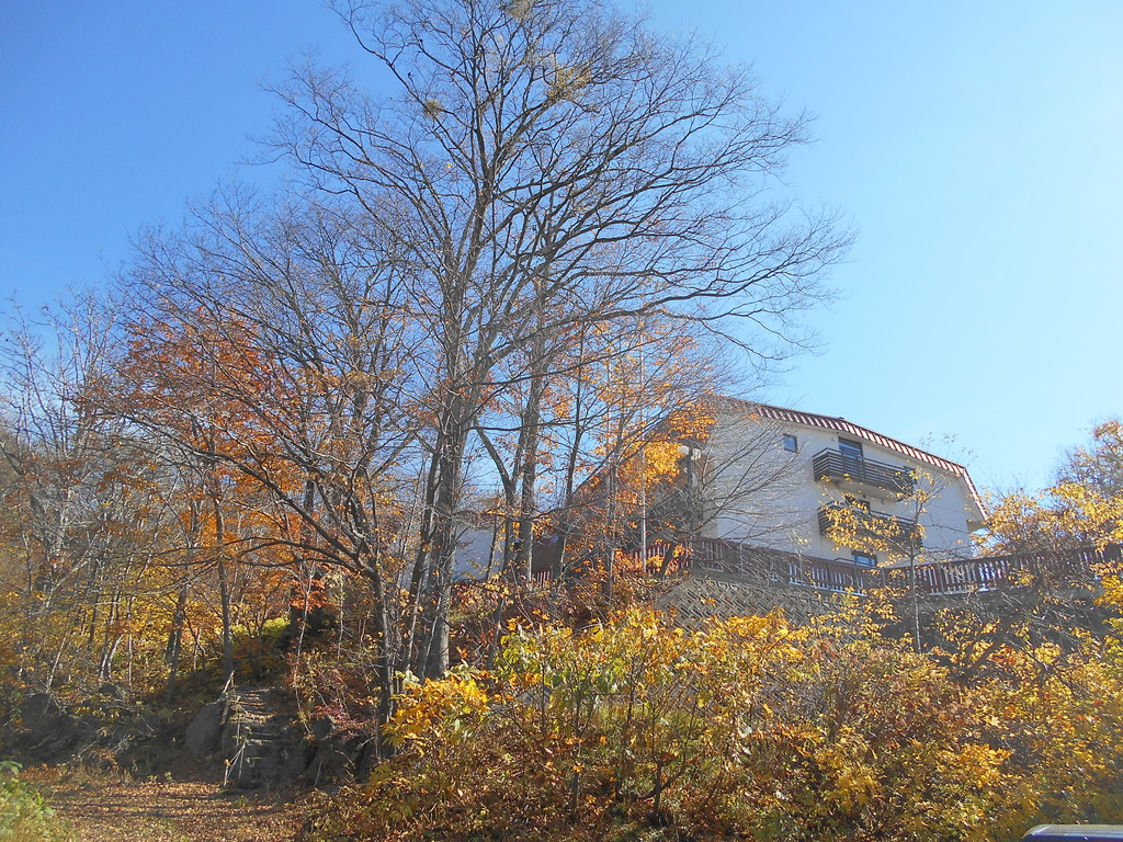 玄関前落葉し後ろの山も落葉が始まりました、落ち葉が駐車場前面に落ちています。庭の植栽の雪囲いも終わりました!!!年末年始予約も多く入りいよいよスキーシーズン・10月19日から蔵王エコーラインは夕方5時から翌朝8時迄凍結と雪の為通行止めになりました。11月5日冬季道路閉鎖になります。