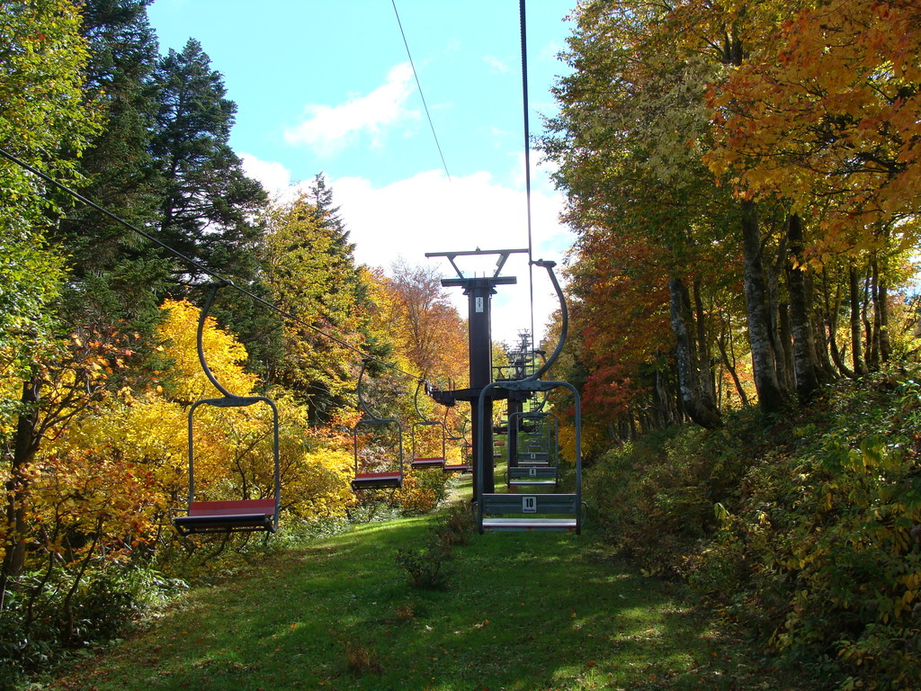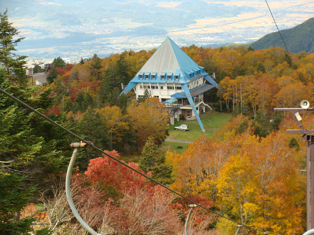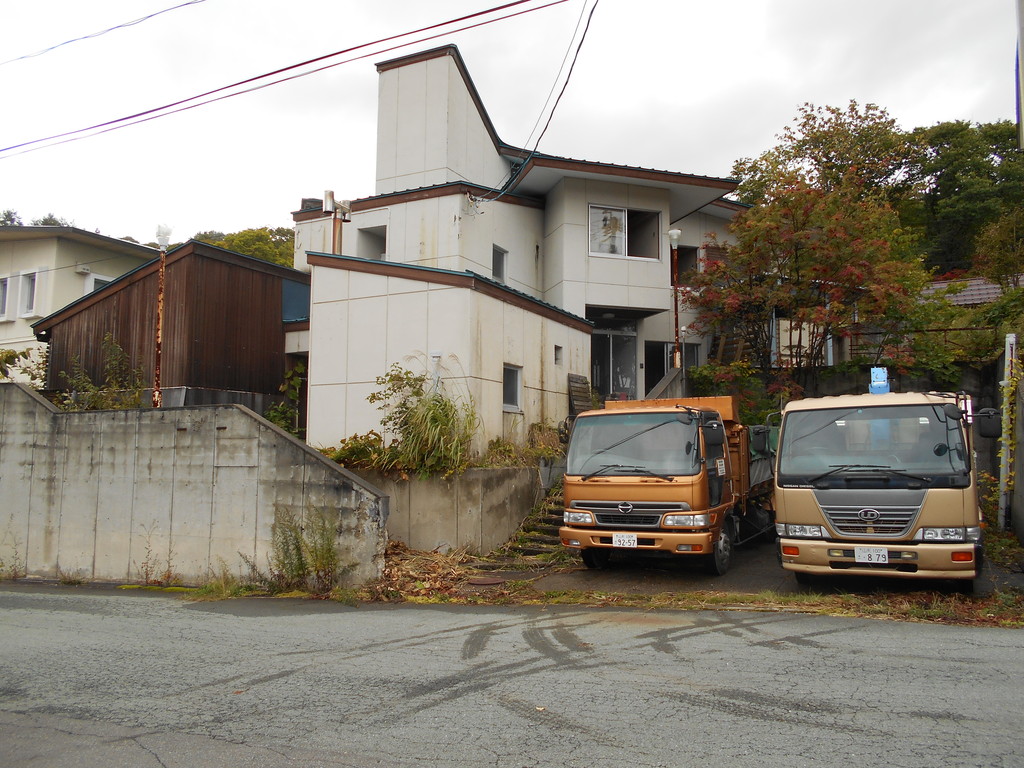 ル・ベール蔵王玄関前・朝7時・8度(今シーズン一番寒い朝)・曇・無風、今日11時より鳥兜山山頂蔵王大黒天様秋季例大祭が行われます、中央高原紅葉・黄葉が見頃です。写真は中森道路真ん中にある荘内銀行蔵王山荘解体作業工事の為備品・内部構築物を撤去しに来たトラックです。中旬には重機で解体を行います!!!