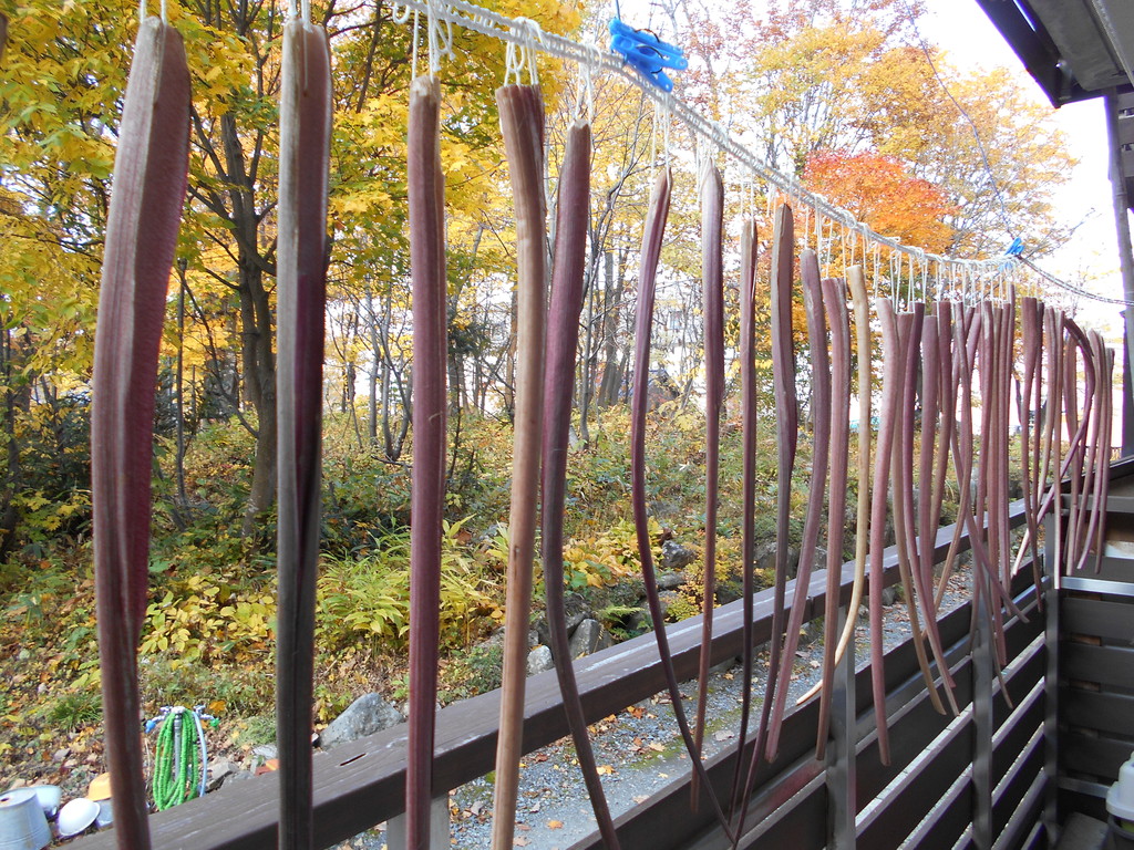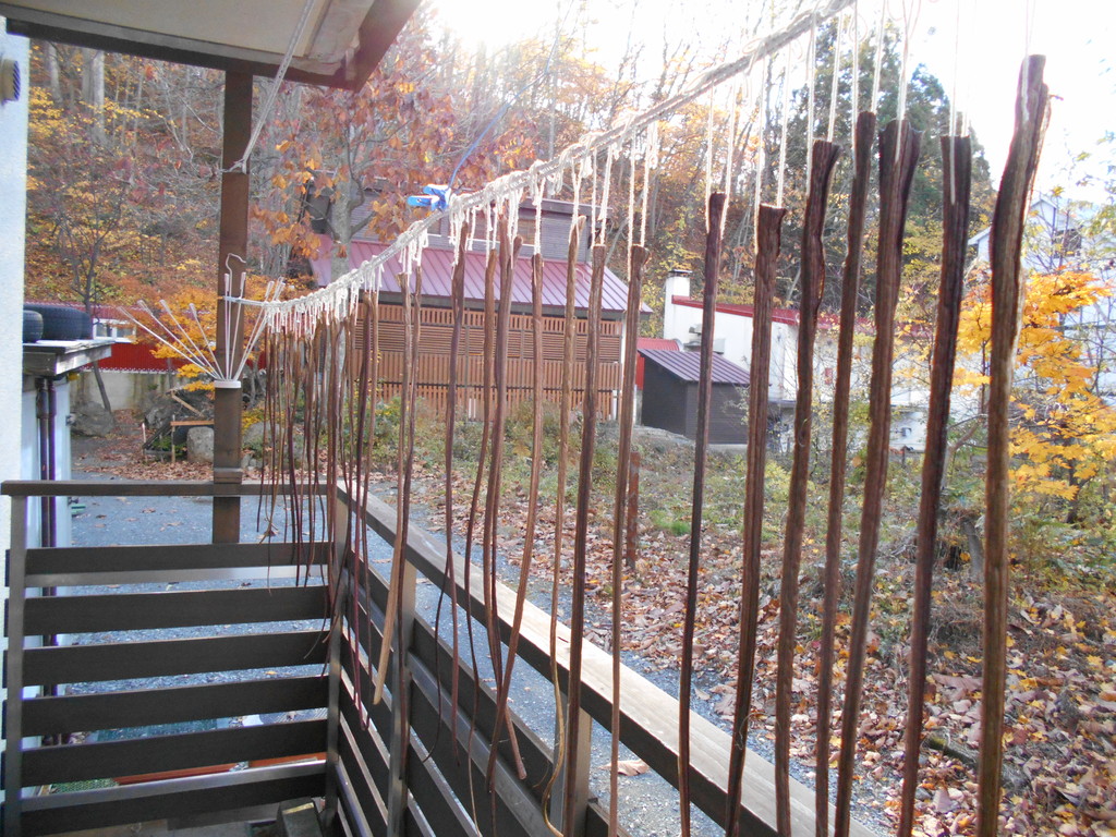 ル・ベール蔵王玄関前・朝7時・4度・晴・弱風・標高1,400m以上雲の中、昨日スタッフが地蔵山頂へ行きましたが雪が降り氷が出来ていたとの事でした。山麓駅から10月一杯天候情報をFAXすると連絡がありましたが10月20日以後送信ありません!!!写真は女将が造っている蔵王からとり干しです、10月20日吊るしましたが今朝80%水分が無くなり干しあがりました??