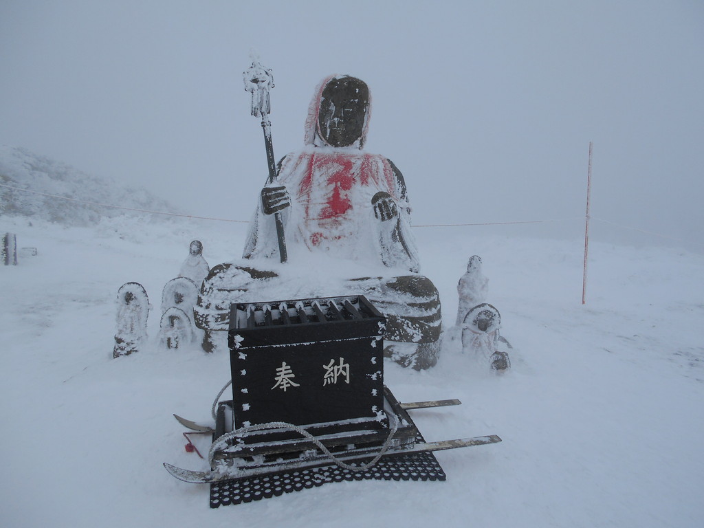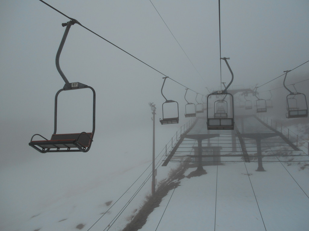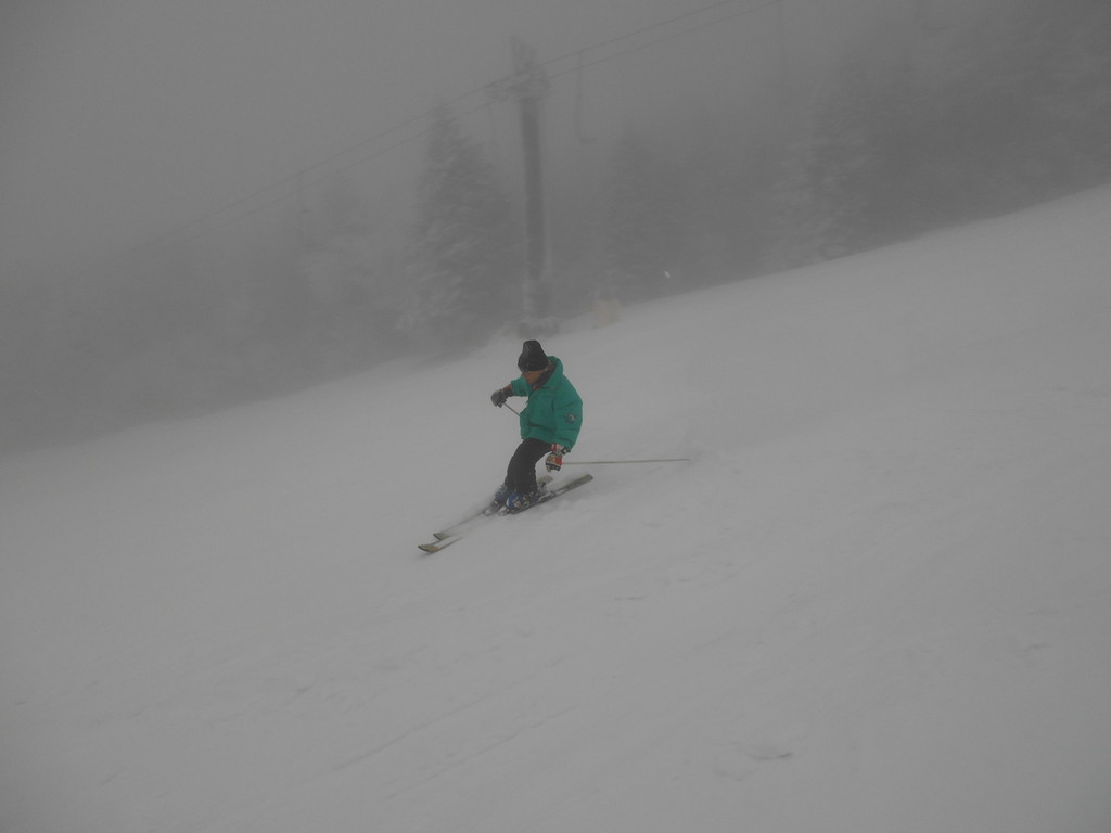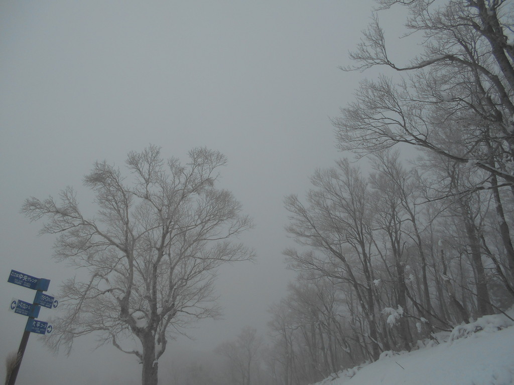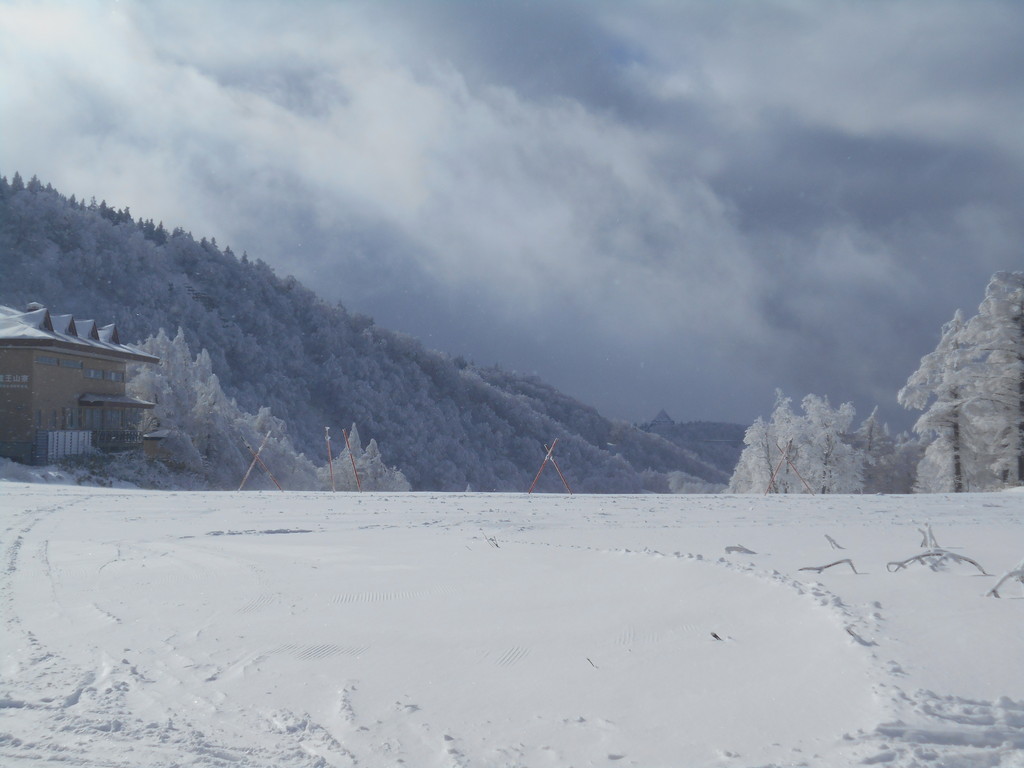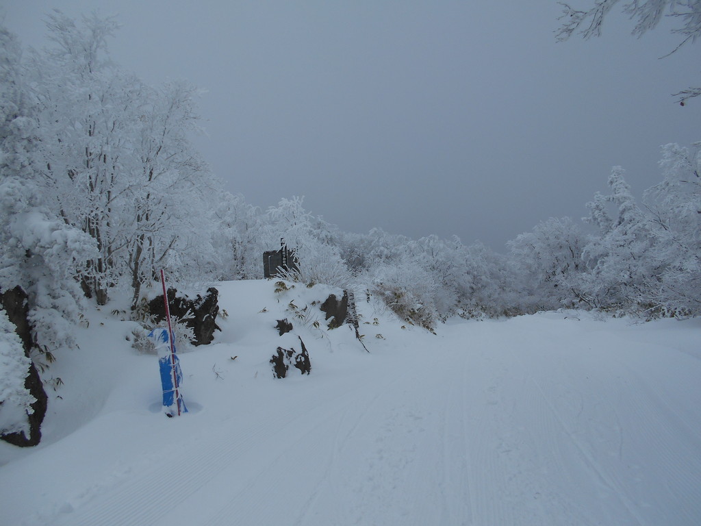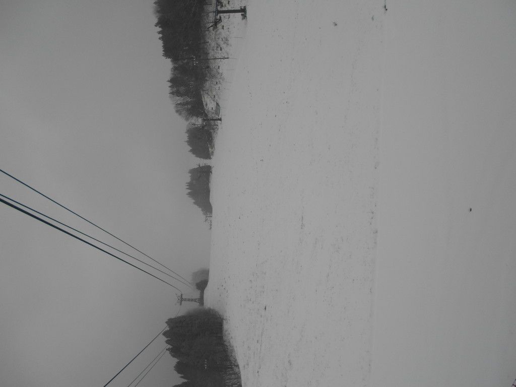 ル・ベール蔵王玄関前・朝4度・濃霧(蔵王温泉街雲の中)・無風・雪模様??昨日大平コースを滑り降りました、大平出口までは全面雪がありましたが上の台ゲレンデ沢山の団体スキー客でゲレンデの草が露出していました。写真は三五郎から大平コースへの連絡コースですロープが張られ滑る場合自己責任です!!!