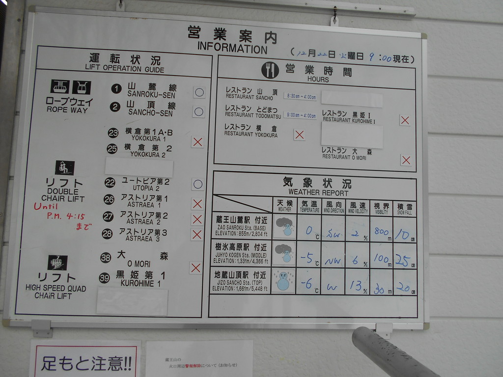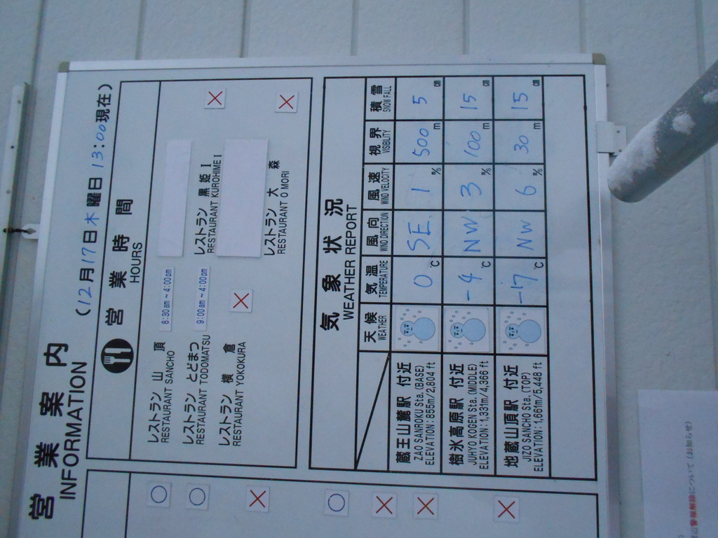 ル・ベール蔵王玄関前・朝7時・1度・曇・無風・新雪1cm、標高1,300m以上には数センチの新雪が積もった様です???鳥兜駅のレストハウス102のメニューです、ラーメンがおすすめです。