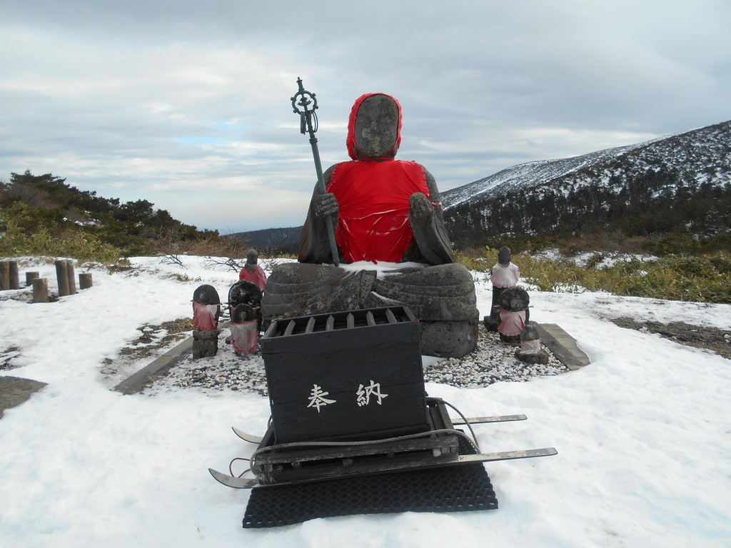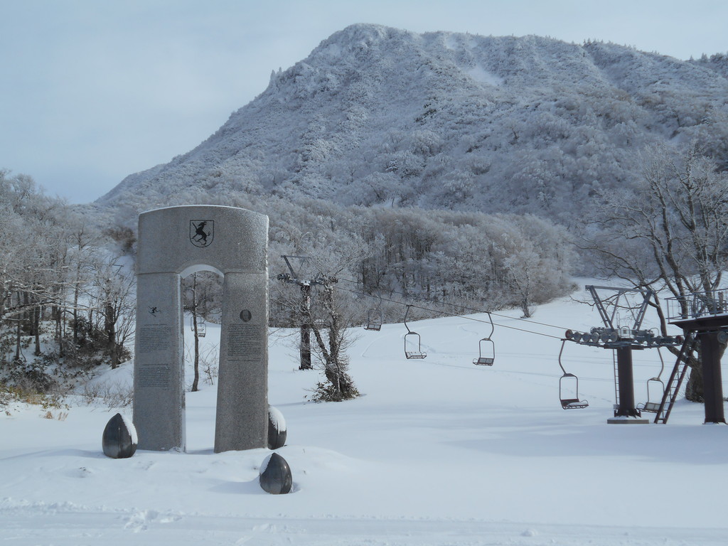 ル・ベール蔵王玄関前・朝7時・0度・薄晴・無風・視界良好、昨日標高900m中森ゲレンデを温泉駅迄滑り降りました。帰館は鳥兜ゲレンデ標高1,387m→紅葉峠→大平コース→上の台ゲレンデ→サンライズゲレンデ→かもしか大橋→中森ゲレンデをピステン圧雪無の大平コースを滑りました。標高1,200m以下は水分の多い新雪重たくくたびれる滑走でした!!1鳥兜ー6度と鳥兜ゲレンデはピステンで圧雪され滑りやすかった!!!写真は紅葉峠の高松宮妃殿下御歌碑です!!!