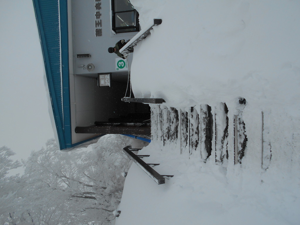 ル・ベール蔵王玄関前・朝7時・0度・濃霧・弱風・新雪20cm・積雪50cm以上・今朝から蔵王中央ロープウェイ山頂鳥兜リフト営業開始・初滑りに沢山のスキーヤーお出でになります!!!蔵王ロープウェイ樹氷高原のユートピアリフトも営業開始???