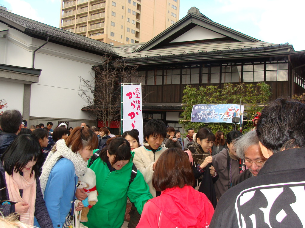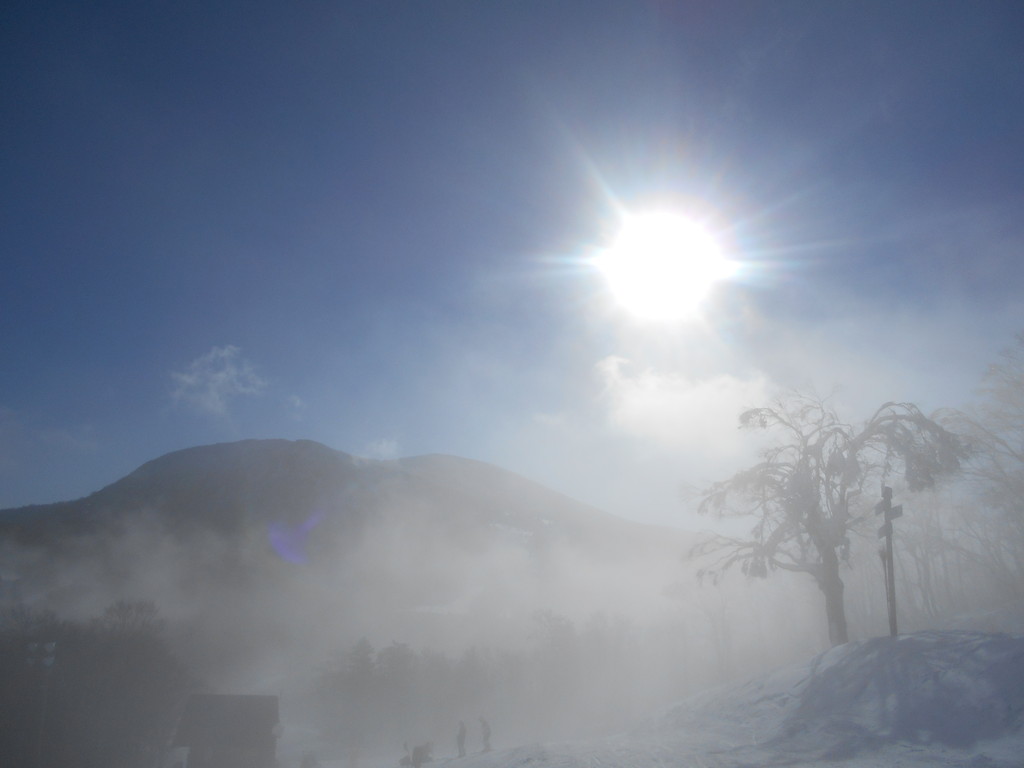 ル・ベール蔵王玄関前・朝7時・0度・薄晴・視界良好・無風、昨日鳥兜リフト・ユートピアリフト・温泉第一リフトの3本営業、高鳥コース、大平コースを滑り降りるスキーヤー・ボーダーが多く中森ゲレンデもシュプールが多かった。昨日山形市中央紅の蔵で蔵王温泉名物からから汁(岡本太郎翁命名)のふるまいを蔵王温泉街女将会えくぼ会が行った。蔵王のゆるキャラ「樹氷一家」・ミス花笠・米沢「愛の武将隊」がお客様をお迎えした。