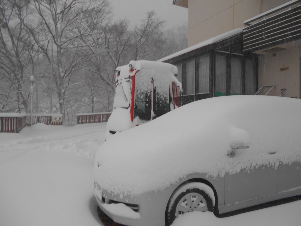 新雪20cm除雪車で駐車場早朝から除雪しています。