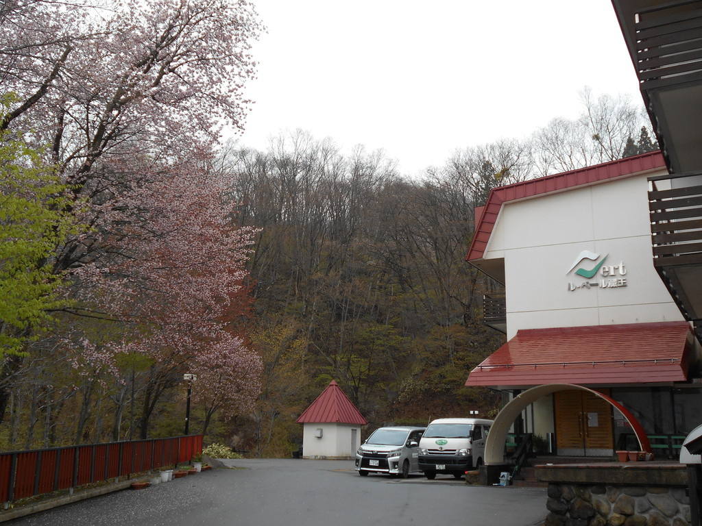 蔵王玄関前・朝7時・8度・小雨・無風、明日から3日間県内外のジュニアサッカー大会が山形市内で行われます。5日迄3日間40チーム900名が集い蔵王温泉に宿泊します。べにはな杯開催のお知らせと元竜山荘古川支配人からメールが入りました!!!写真は満開の蔵王温泉一巨木の山桜とル・ベール蔵王の玄関です木々も新緑の若葉が芽生えました。