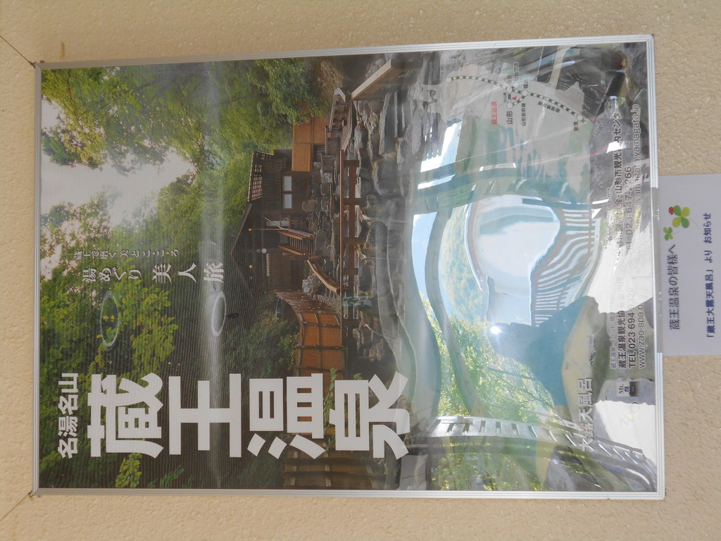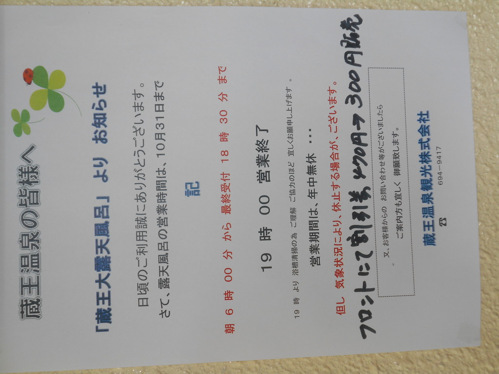 ル・ベール蔵王玄関前・朝7時・9度・快晴(春の陽がサンサン)・弱風、今朝7時30分スタート蔵王エコーライン宮城側入口から刈田山頂まで18,74km・標高差1,334mのコースを1,500名の選手が蔵王ヒルクライムエコ2016に自転車で挑戦します、12時30分迄宮城県側の蔵王エコーラインは交通規制され通行止めです。写真は歩いて1分隣の源七露店の湯看板です、入浴料450円がフロントで350円の割引入浴券があります。