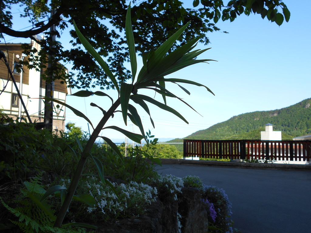 ル・ベール蔵王玄関前・朝7時・12度・晴・中風・エゾハルゼミが鳴いています!!写真はドウタンです。