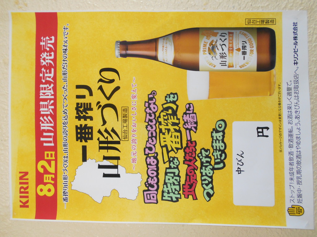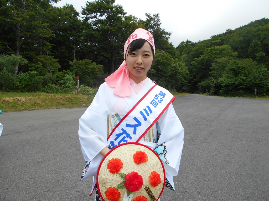 ル・ベール蔵王玄関前・朝7時・19度・晴・無風、昨夜で終了した花笠まつりの花笠を昨年度ミス花笠が持参し蔵王大権現様に奉納し花笠まつりの終了になります。蔵王スカイケーブルが運休しているので蔵王中央ロープウェイで鳥兜駅まで登り夏山リフトで中央高原駅前の蔵王大権現堂で例大祭を行います。写真はキリンビールが山形県産ホップを使用して仙台工場で製造した一番搾り「山形ずづくり」のポスターですレストランでお飲みいただけます。