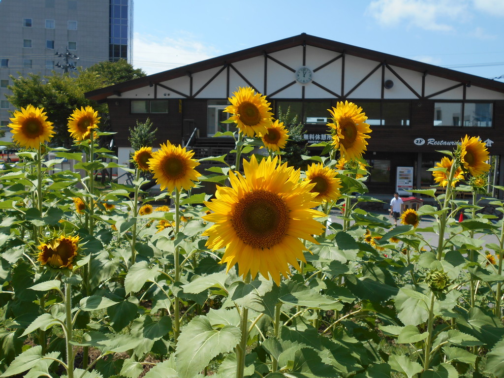 ル・ベール蔵王玄関前・朝7時・18度・快晴(夏の陽がギラギラふりそそぎ蝉が大合唱)・弱風、今日18時〜21時30分迄山形市中心街で第54回花笠まつりが開催されます、8月7日迄3日間パレードに165団体13,904名踊ります。本町から山形市役所前迄本通りを踊ります。