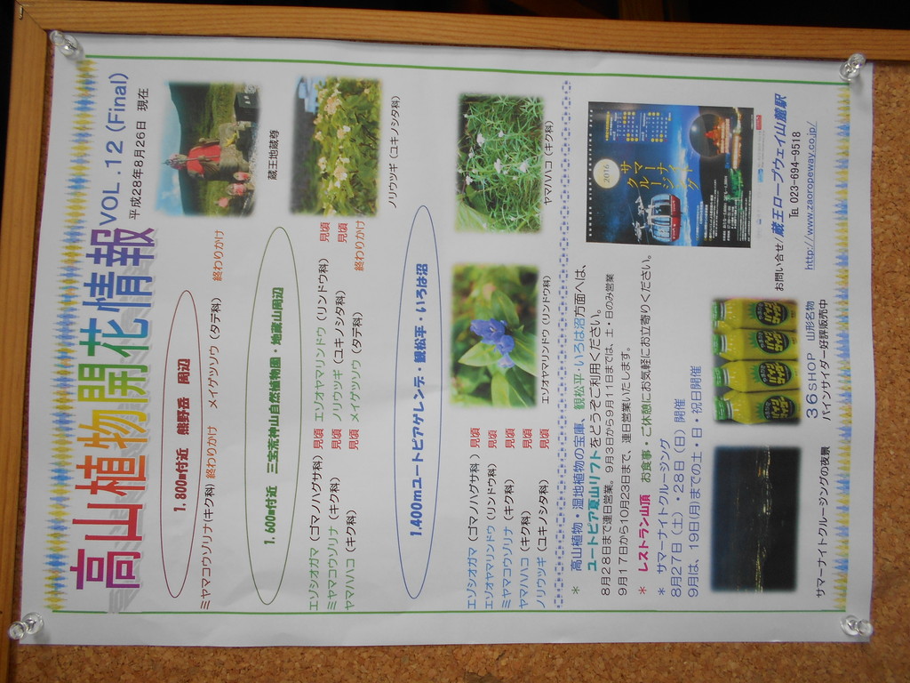 ル・ベール蔵王玄関前・朝7時・19度・快晴・無風、ミーミーゼミが大合唱、昨日の夕方からはヒグラシがカナカナカナと鳴き始めました!!!昨日蔵王ロープウェイ山麓駅から高山植物開花情報VOL.9号が届きました、ロービーに展示しました。標高1,400mユートピアゲレンデ・観松平・いろは沼地域の高山植物見頃です!!!