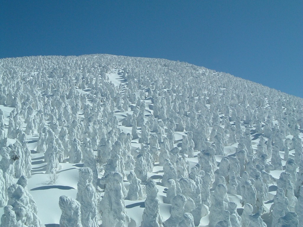 ル・ベール蔵王玄関前・朝7時・19度・晴・無風、8月2日吉村山形県知事定例記者会見でやまがた百名山選定の50山発表されました。皆様にお願いしていた蔵王山5山の内熊野岳・地蔵岳の2山が蔵王温泉関係で選定されました。有難うございました。写真は冬の樹氷におおわれた地蔵岳です!!!年度内に残り50山が選定されますが延べ応募山数2,774山からです。