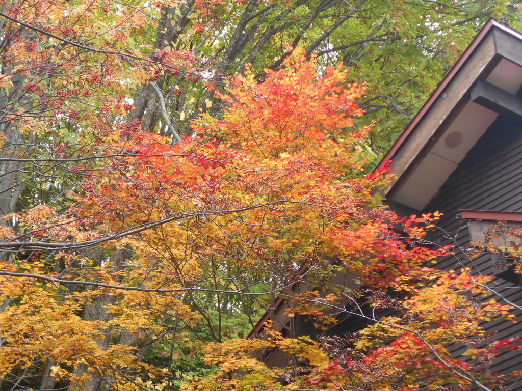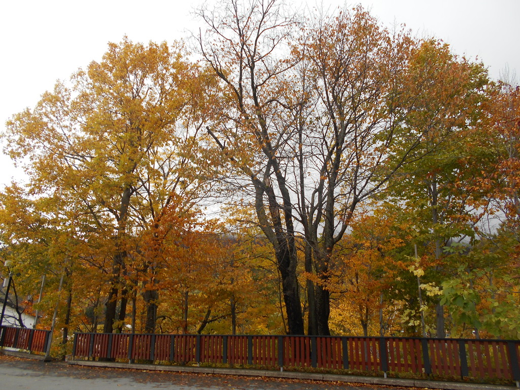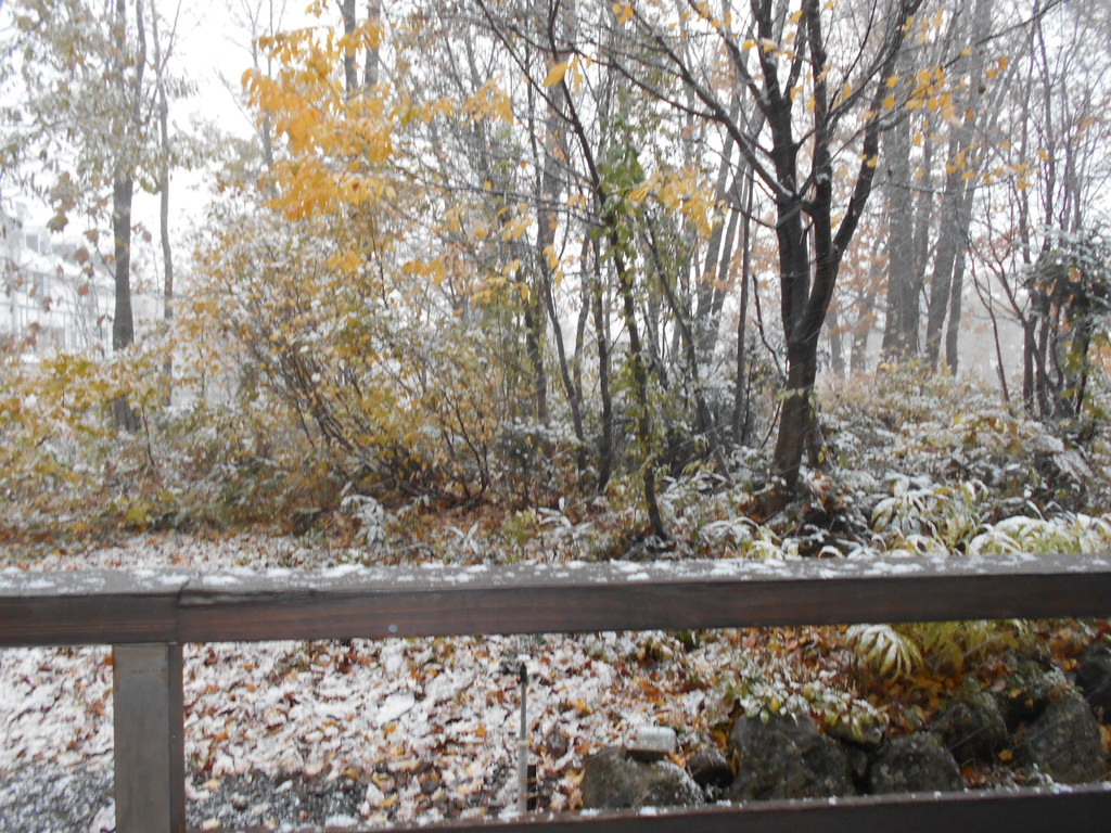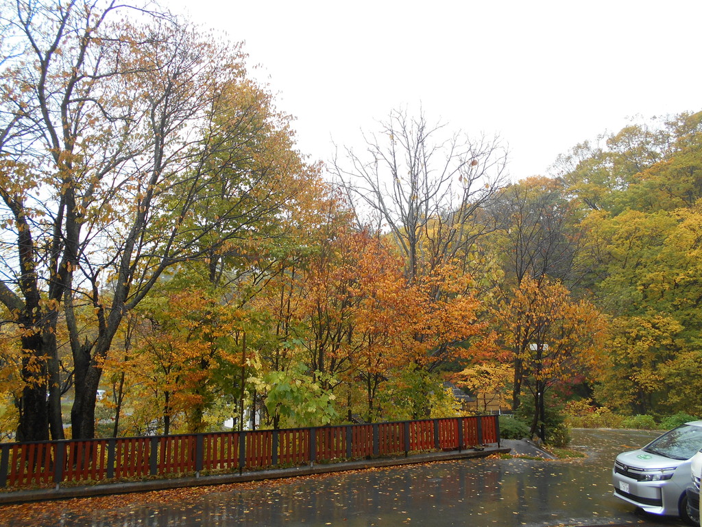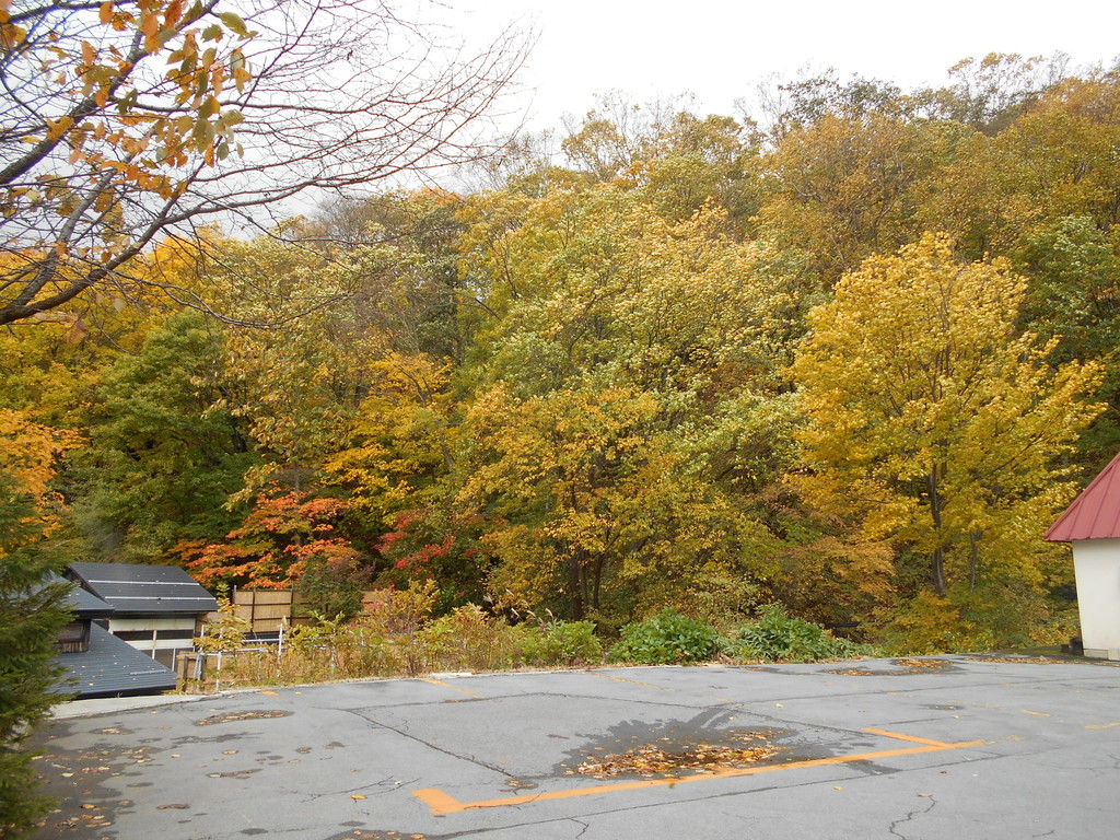 ル・ベール蔵王玄関前・朝7時・6度・秋日和晴天・微風・陽がサンサンと終わりかけの木々に降りそそぎ地面には落葉が一面に落ちています!!!