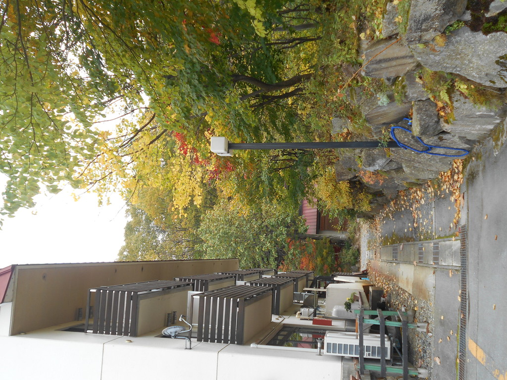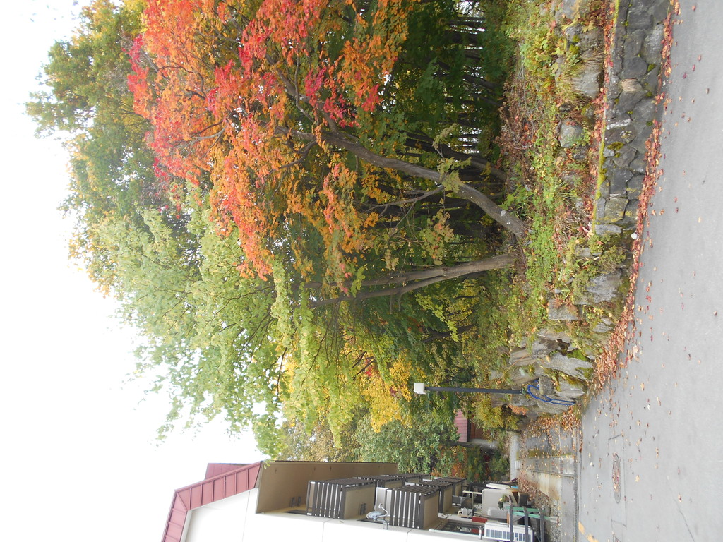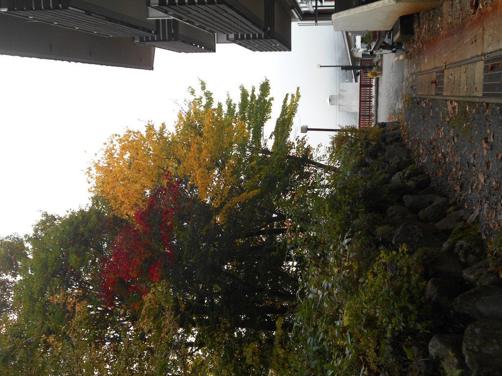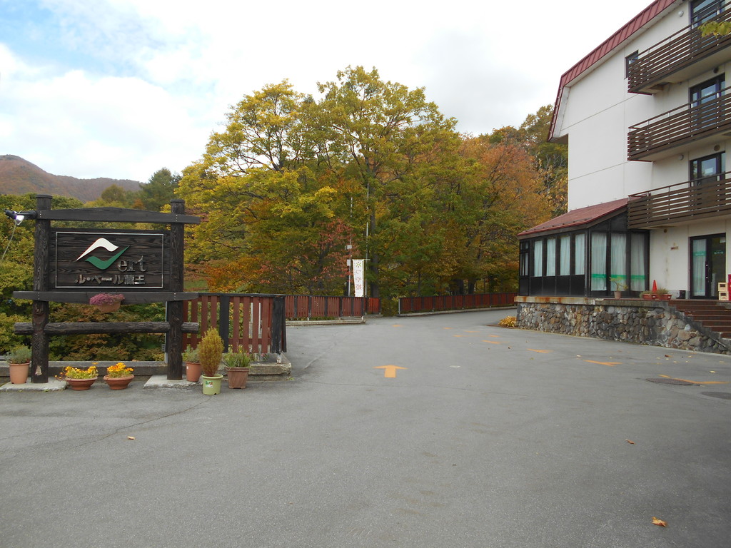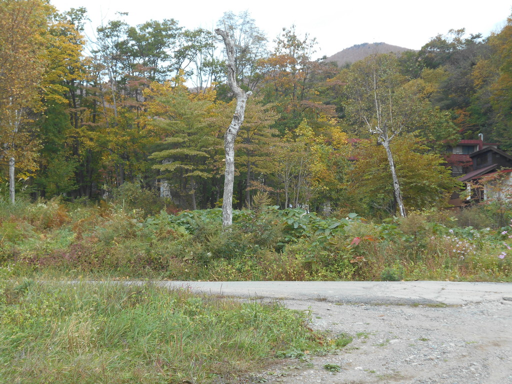 ル・ベール蔵王玄関前・朝7時・6度・秋日和晴天・微風・陽がサンサンと終わりかけの木々に降りそそぎ地面には落葉が一面に落ちています!!!