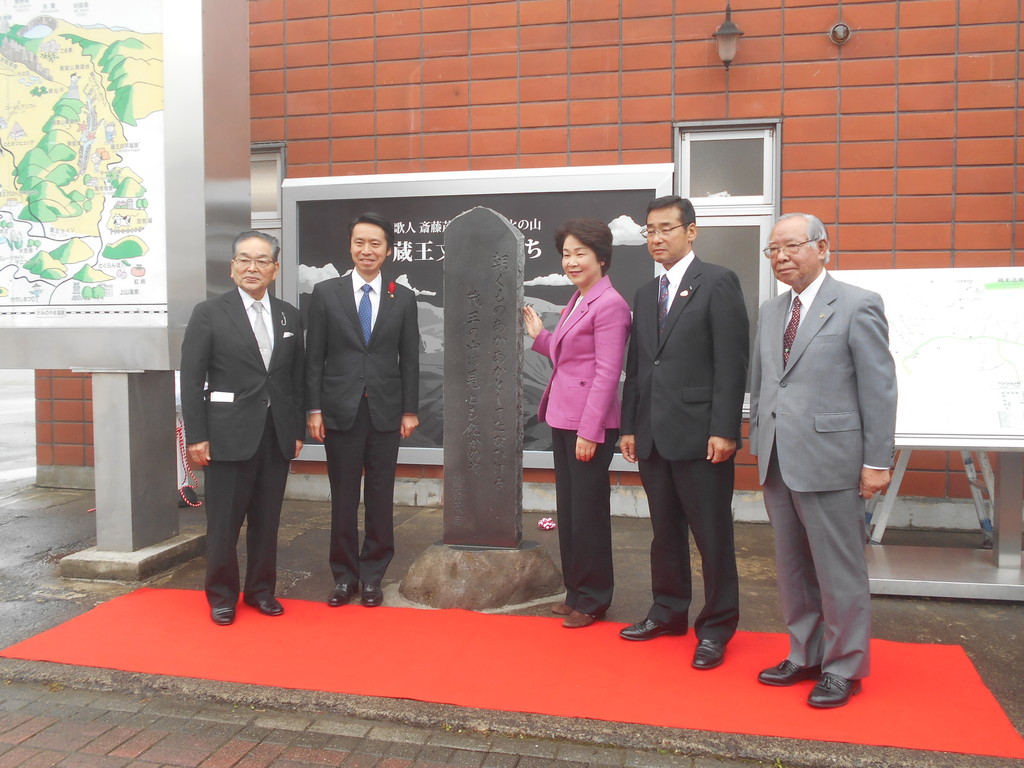 左から斎藤茂吉記念館長・佐藤山形市長・吉村山形県知事・平井山形県観光物産協会長・荒井荒正会長(50年前齋藤茂吉翁歌碑を蔵王山に建立し新名所の提唱をした方)が除幕をしました!!!