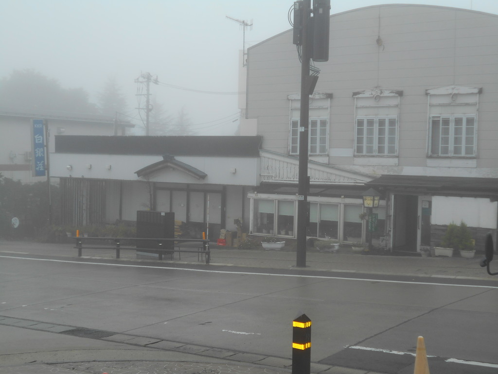 ル・ベール蔵王玄関前・朝7時・12度・雨・濃霧・視界不良・トレッキング森林浴は雨具で行く事になります。足元が悪くスリップするのでご注意!!!