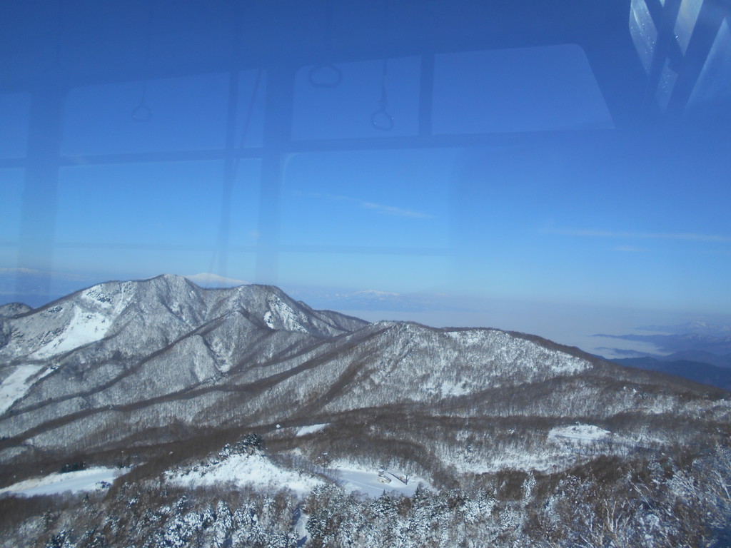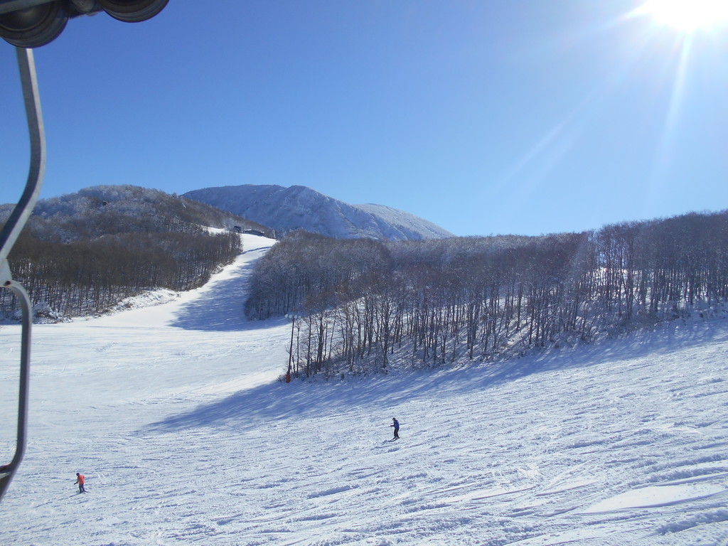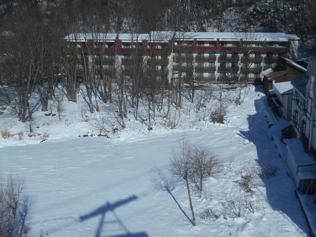 ル・ベール蔵王玄関前・朝7時・1度・小春日和・視界良好・陽がサンサン雪焼けする日です・無風・昨日中央ロープウェイで登り中央ゲレンデで初すべりをして来ました!!!若者が大平コース→サンライズ→中森ゲレンデを滑り降りて来ています。