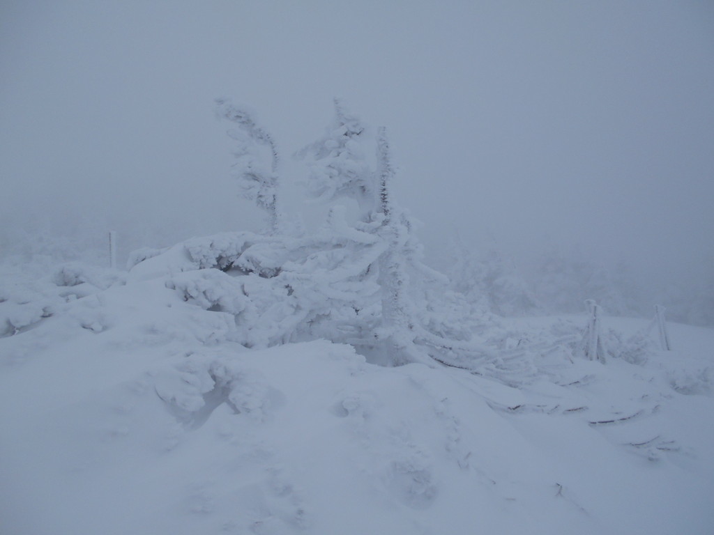 山頂のアオモリトドマツ海老の尻尾が出来ていました。山頂の吹溜り1m以上の積雪で登山木道から外れると膝上までズボット入りました!!!