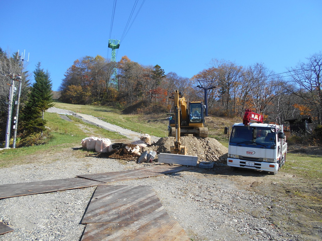 中森ゲレンデにシートを敷きそこに工事用道路を造り一度川堰堤改修工事10月31日迄で工事完了する様作業すると言っていましたがまだ完了していません!!!