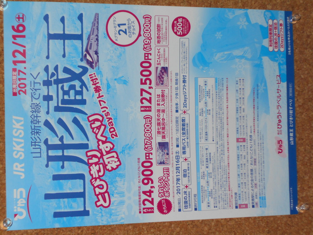 JRびゅうプラザで東京から12月16日(土)早朝発山形新幹線で行く山形蔵王とびきり初すべりが発売されます。宿泊費1泊2食+リフト券2日+新幹線往復+山形駅から往復バス+源七露天の湯+玉こんにゃく+地酒試飲=約40,000円が27,500円で販売されます。ル・ベール蔵王では1名様でもお泊りいただけます。最寄りのびゅうプラザでル・ベール蔵王がOKしていると指定し購入して下さい。
