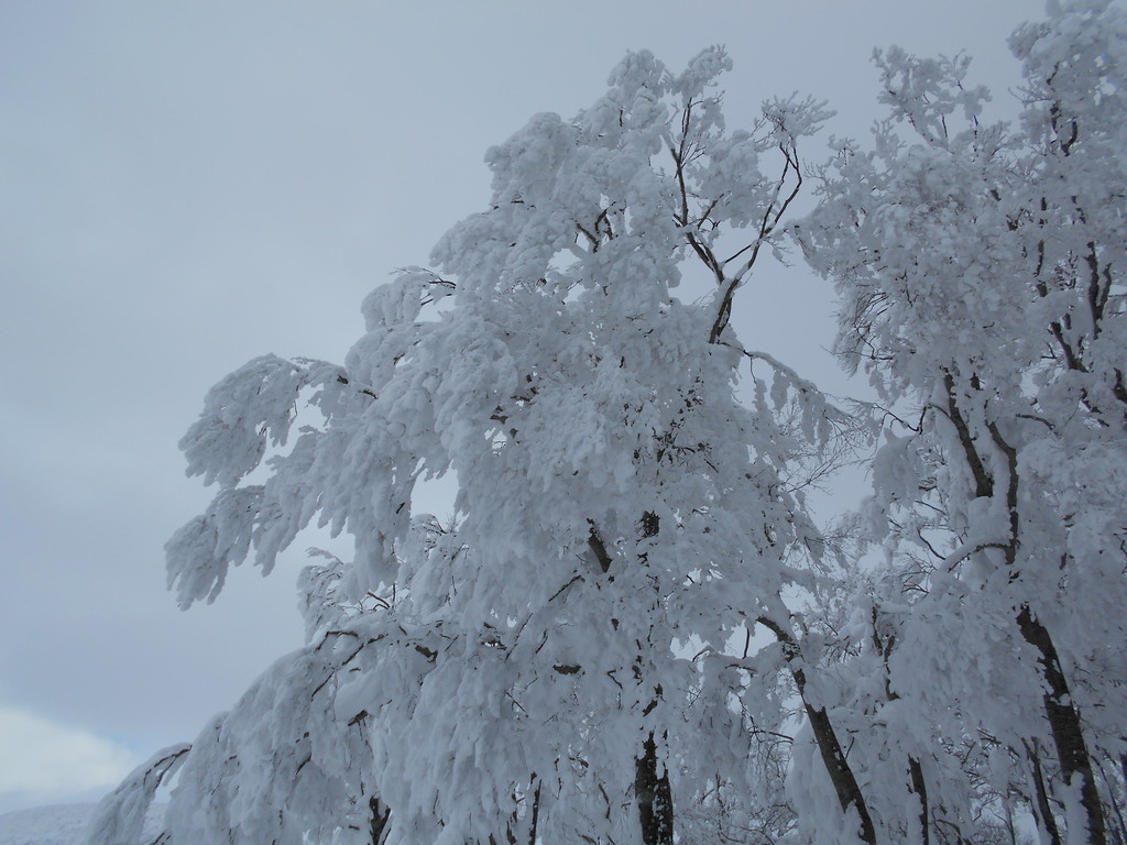 鳥兜駅右のブナの木水分の多い12月の雪が枝に団子の様に張り付いています。