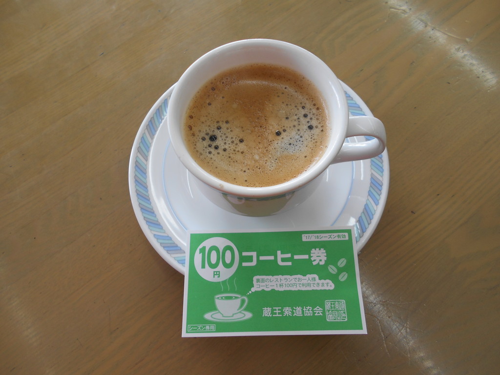 シニアリフト券を購入するとコーヒー100円券が配布されます。鳥兜駅のコーヒー100円では味わえない程美味しいコーヒーです。是非お飲みになって下さい。通常300円です!!!