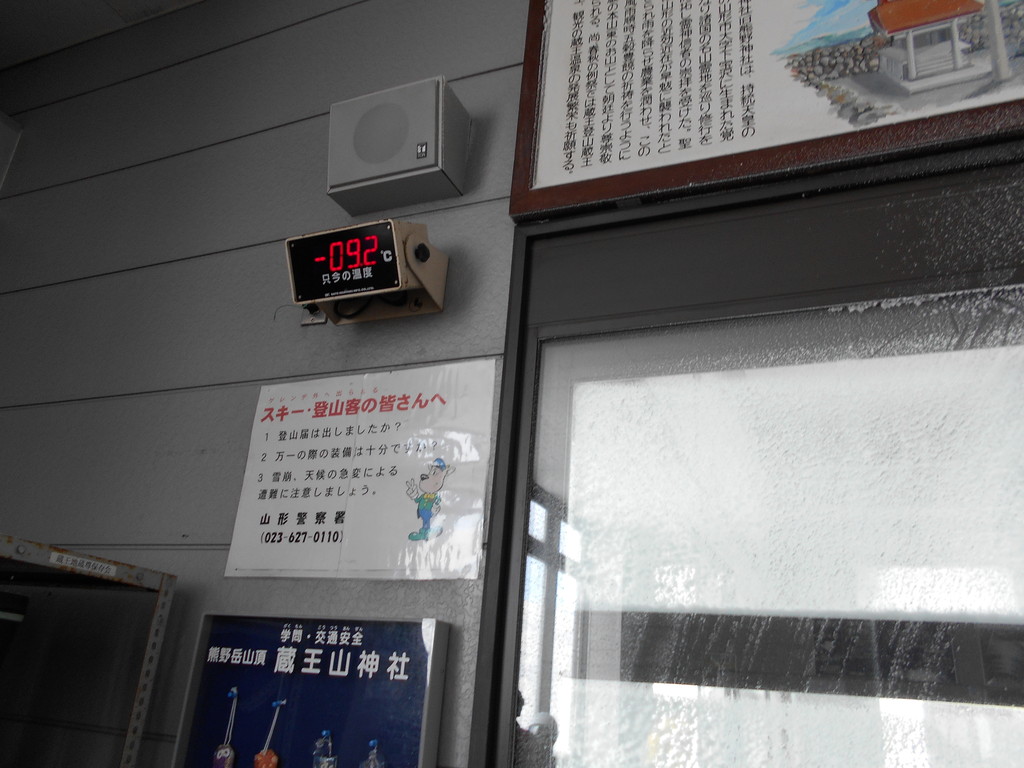 地蔵山頂駅の出口左上にデジタル温度表示機が有ります。昨日はー9,2度でした。風も数メートル吹いていて体感温度はー15度と凍える様な寒さでブーツの下でキュキュ雪が鳴きました!!!
