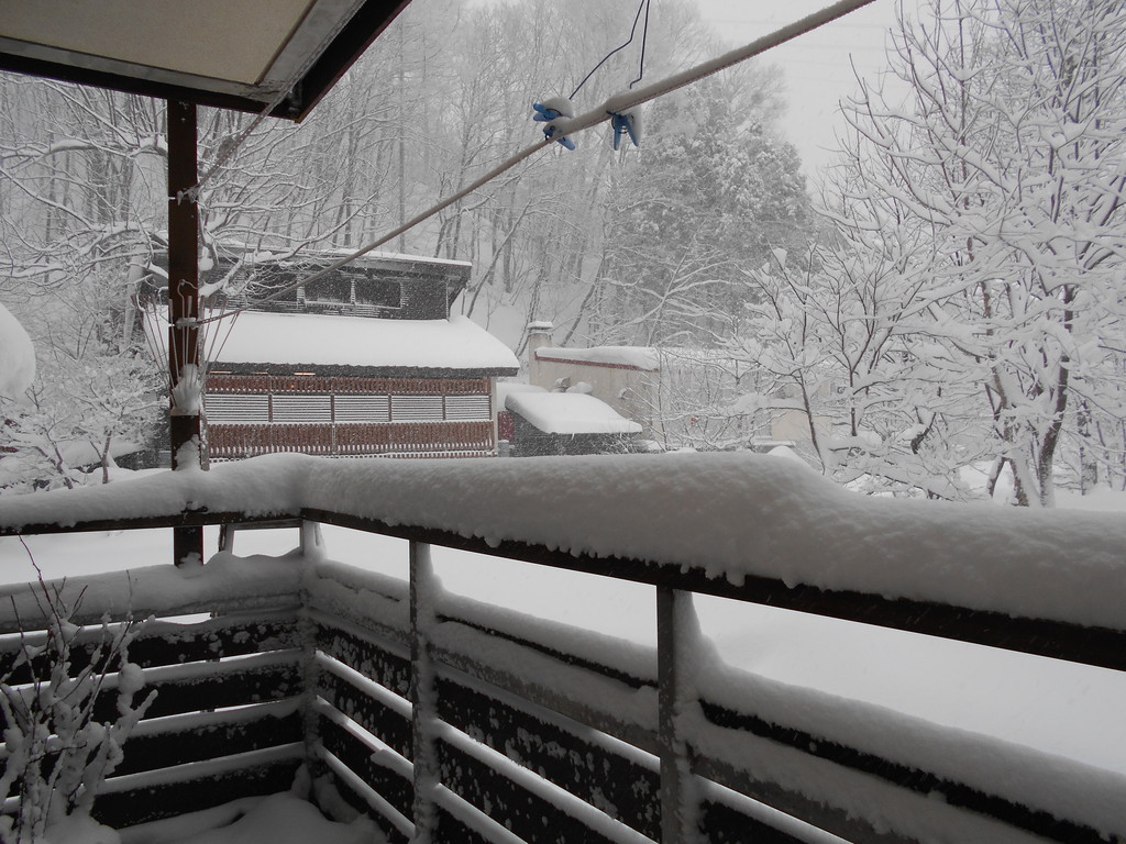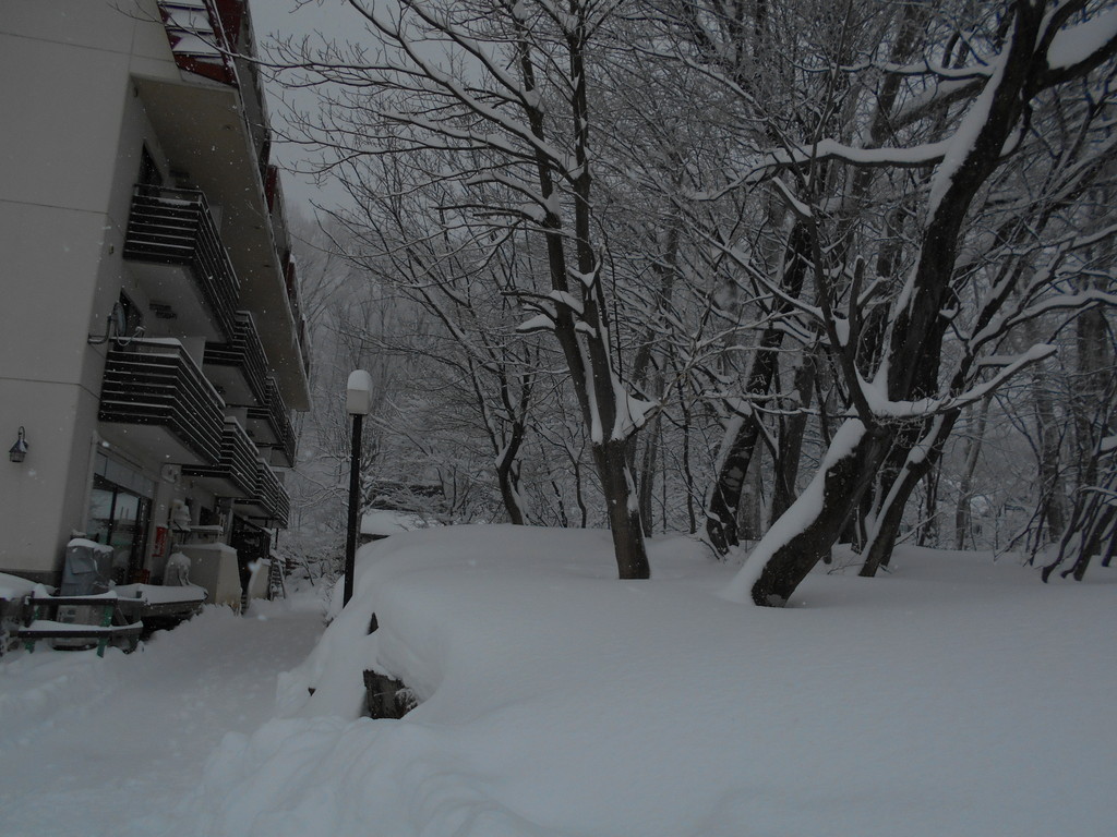 ル・ベール蔵王玄関前・朝7時・−5度・新雪10cm・龍山標高1,250m以上雲の中・