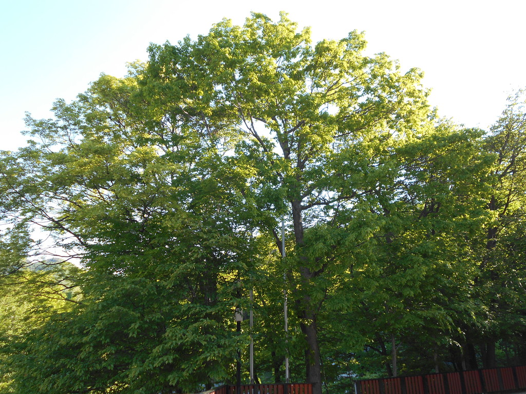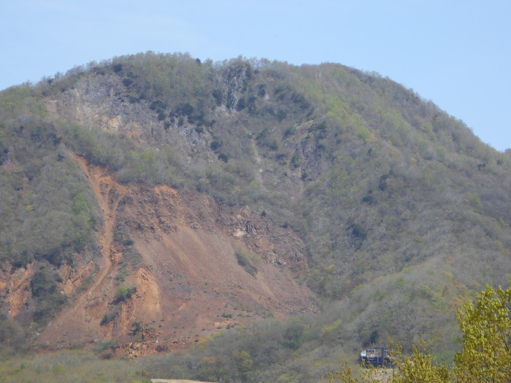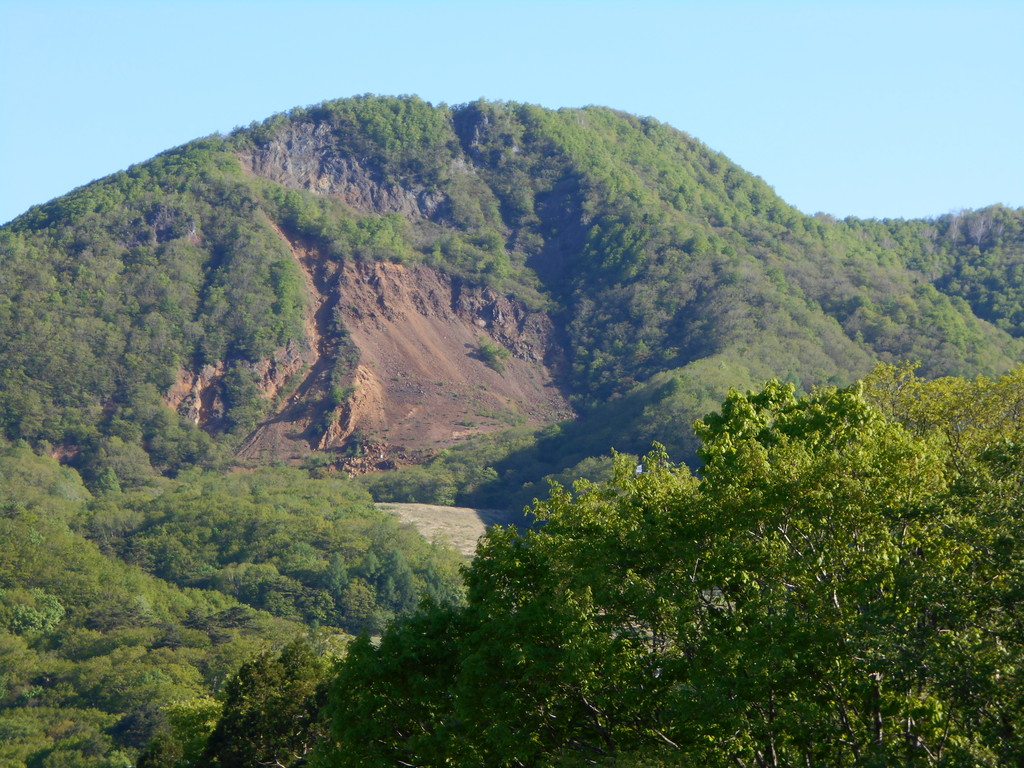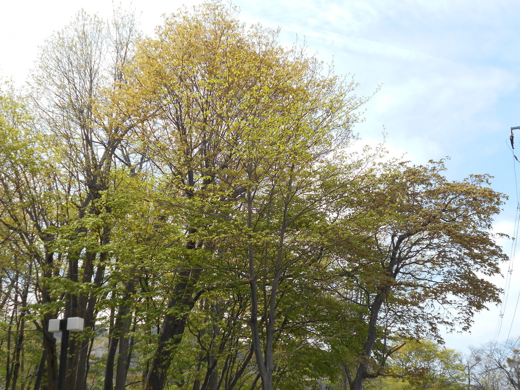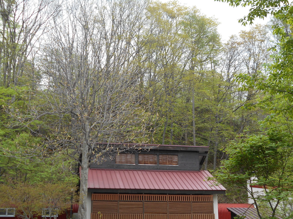 南側の隣の庭新緑です、中森ゲレンデが木々の間から見える様になりました!!