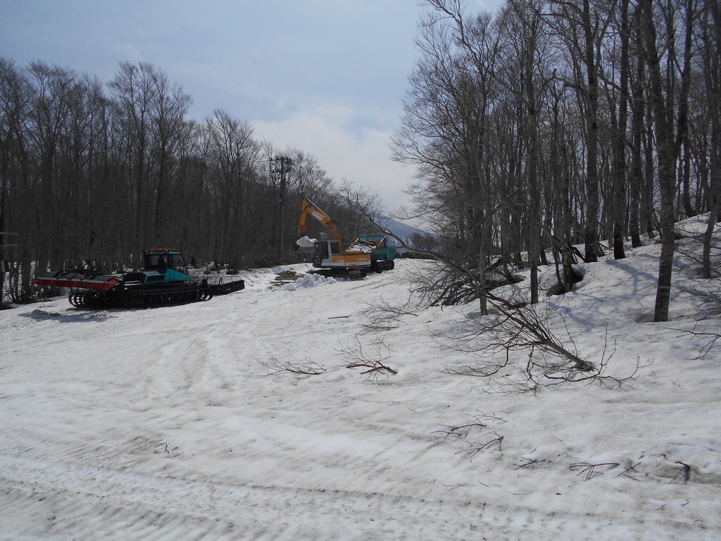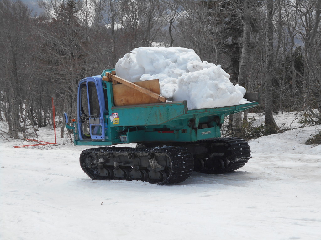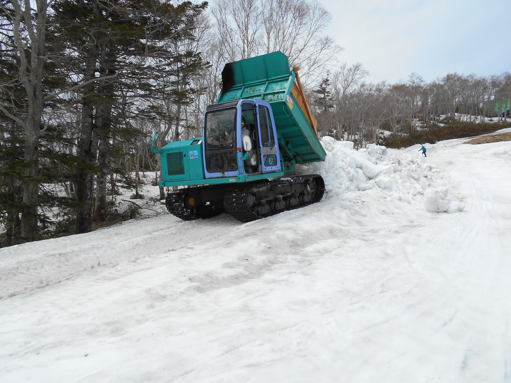 中央ではリフトスタッフが5月6日迄滑走出来る様にと2台の雪上ダンプで大量に雪を運んでくれていました!!!