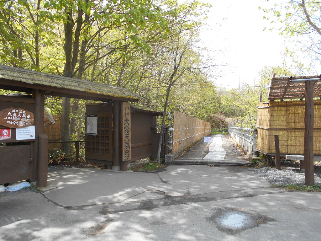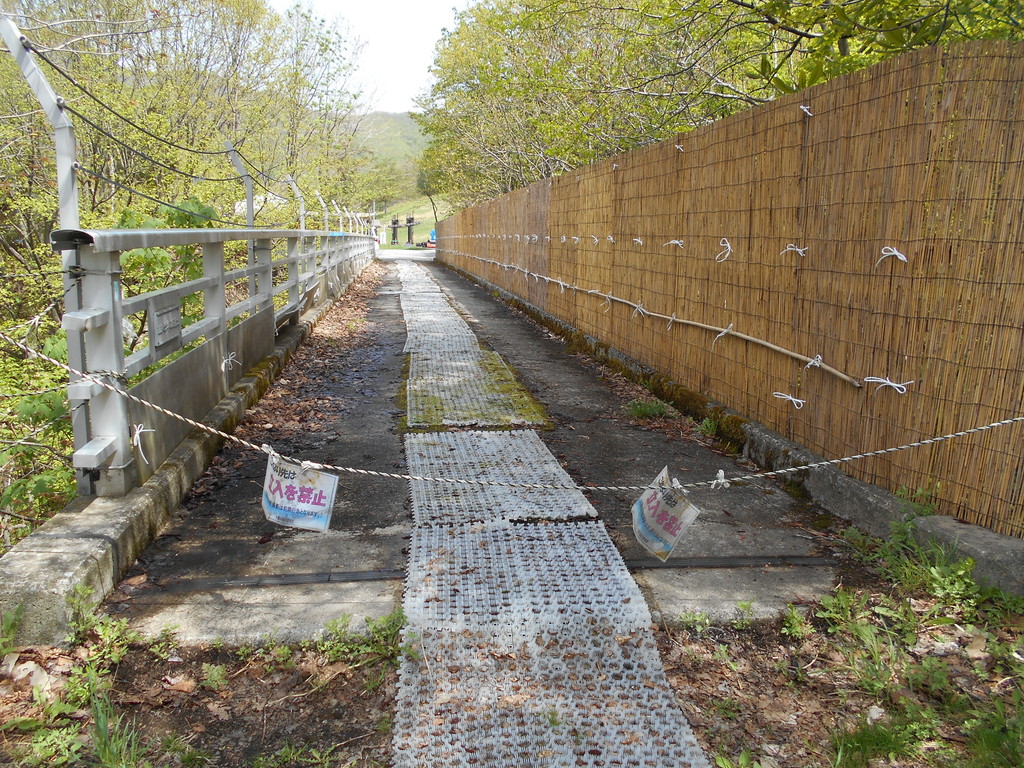かもしか大橋右側の蔵王大露天風呂写真撮影出来ない様に葦簀を張り橋に立入禁止表示しロープを張っています!!!