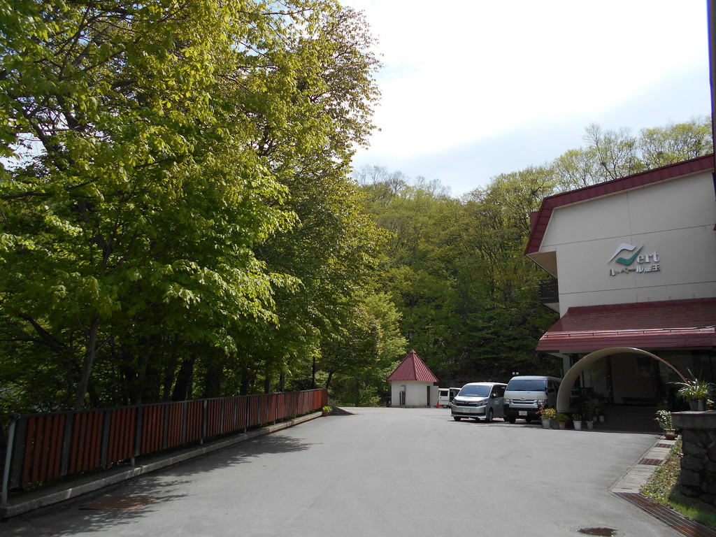 ル・ベール蔵王玄関前・朝7時・6度・曇・弱風・防寒ジャケットが必要です、新緑のブナ林森林浴に最適です!!