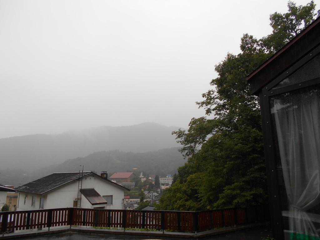 ル・ベール蔵王玄関前・朝7時・18度・濃霧・雨・無風、眼下の蔵王温泉街雲の中・夏ゼミも沈黙。視界10m以下ホワイトアウト!!!今週は山形雨マーク!!!