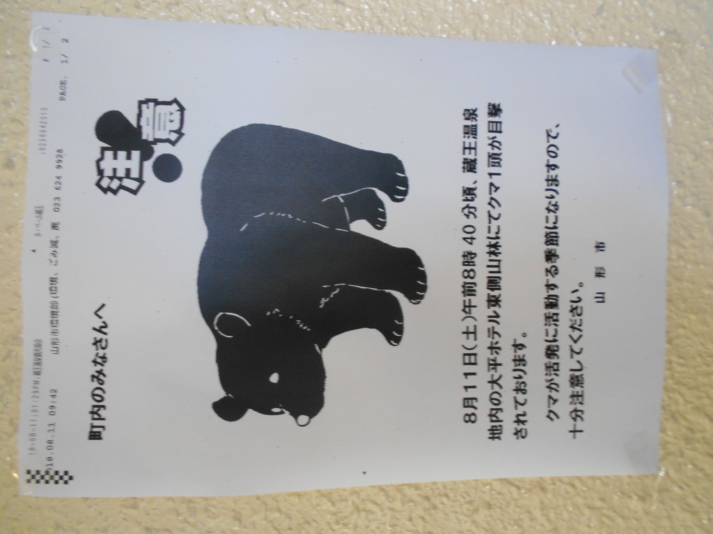横倉の壁のどんでんがら大きくなりました!!!蔵王温泉内に熊が出たと山形新聞に連日報じられFAXで熊情報が送られてきます。お泊りのお客様に夜と早朝の散歩をなさらないようお話ししています!!!