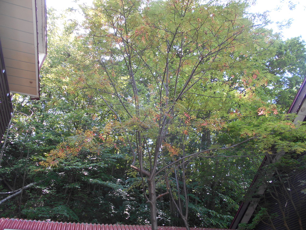 ル・ベール蔵王玄関前・朝7時・23度・晴・微風・ギラギラした陽がふりそそいで夏ゼミの大合唱が真夏日を感じさせます!!窓から入る風は秋の涼しさを運んで来ています!!!